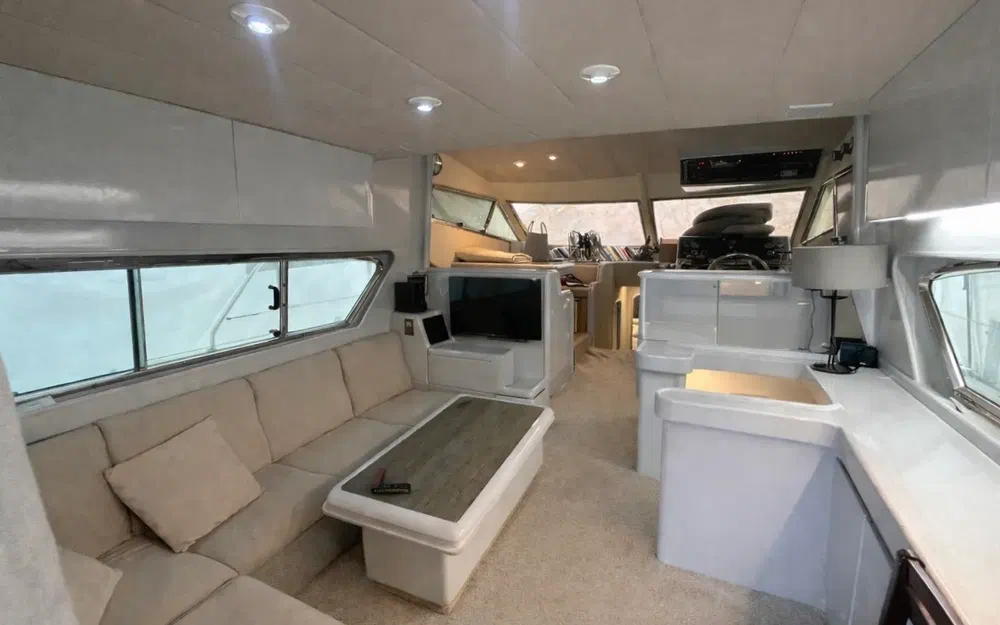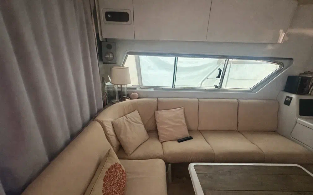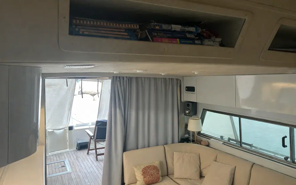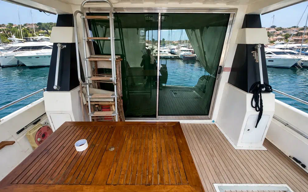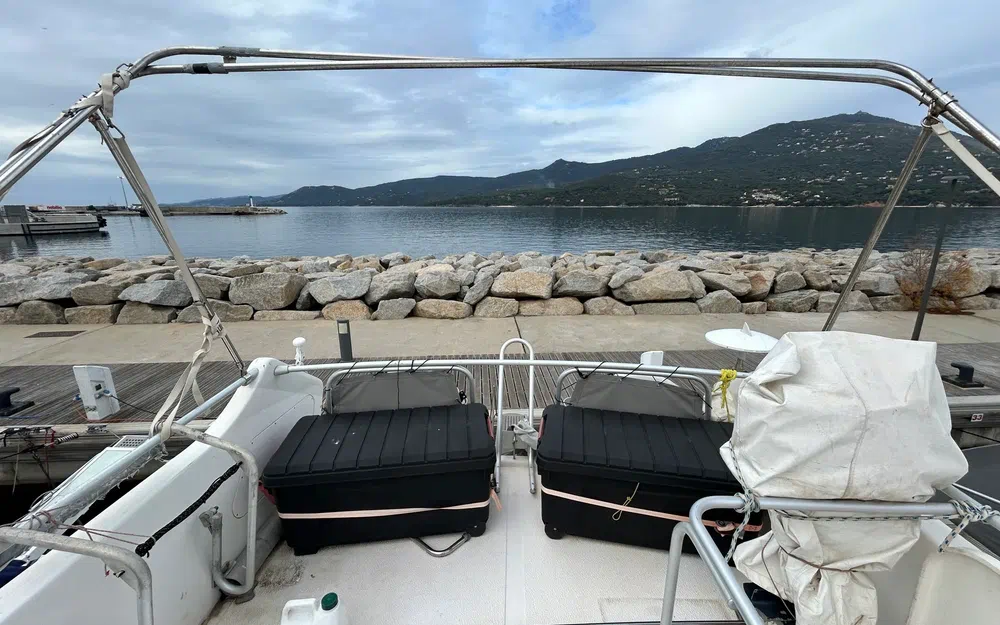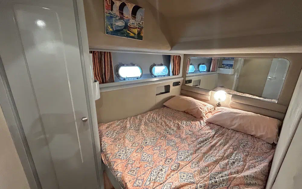 Avec ses 4 cabines, 7 couchages et 2 salles de bain, chacun y trouvera son espace. Que ce soit pour un week-end ou une longue escapade, l’intérieur a été pensé pour marier convivialité et intimité. Profitez du flybridge, du bain de soleil avant et du spacieux cockpit arrière qui offrent de nombreux espaces de détente et de plaisir face à la mer.