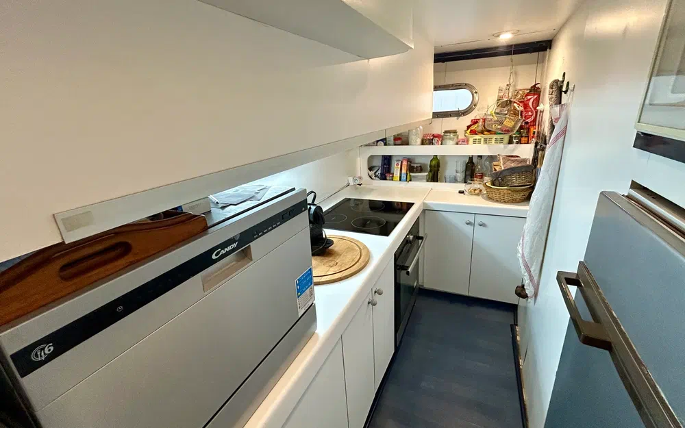 Ce modèle dispose d’une passerelle hydraulique, d’un propulseur d’étrave, d’un guindeau électrique pour faciliter vos manœuvres ainsi que des équipements de navigation complets : GPS, pilote automatique, compas, speedomètre et VHF portable. Côté confort, vous apprécierez le confort d'un groupe électrogène, du lave-vaisselle, du lave-linge, de la cuisine, et même de la télévision pour les soirées au mouillage.