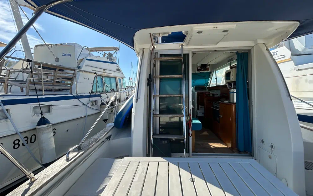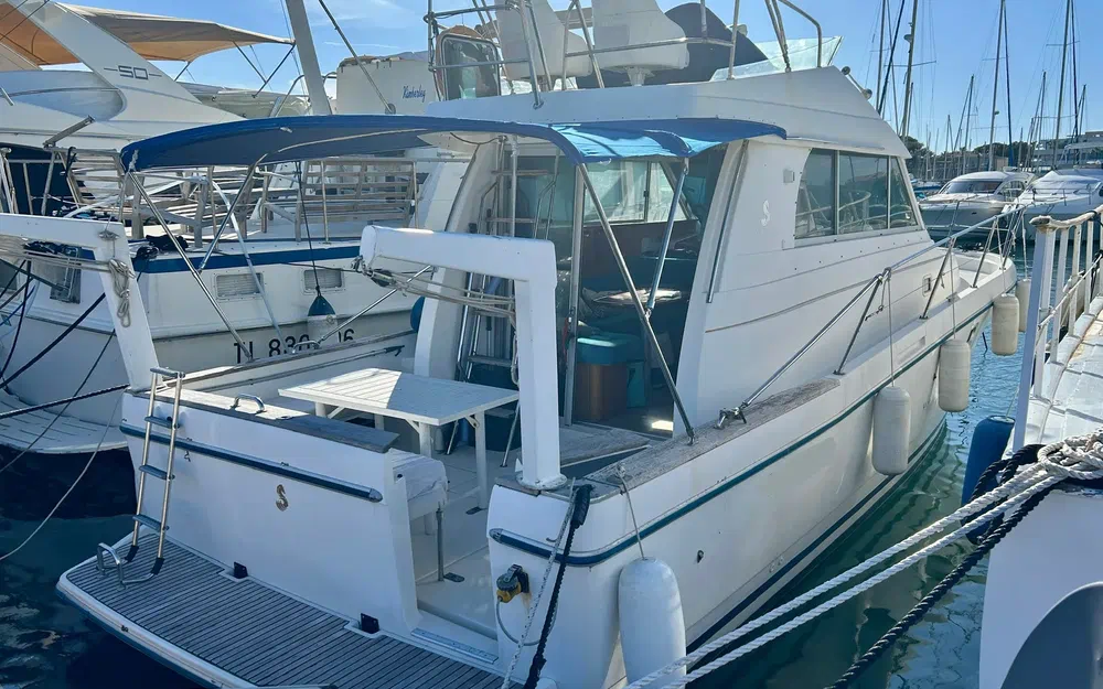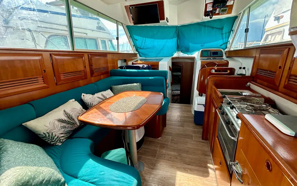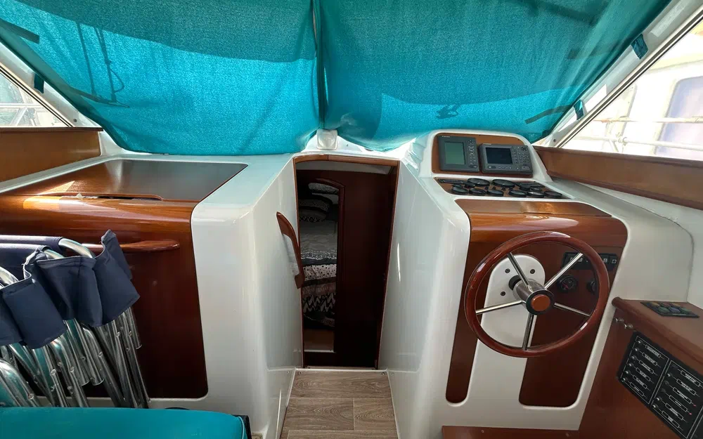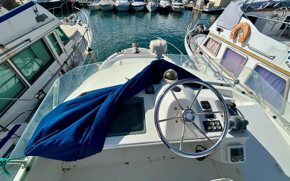La sellerie et la moquette sont en bon état. Les boiseries ont été entretenues à la cire d’abeille, et le carénage a été effectué en avril 2024. La coque est en fibre de verre bleue, tout comme le pont. Le flybridge est équipé de fauteuils récents et protégé par une housse bleu marine (3 ans), assortie au bimini. Des banquettes en L amovibles, une table d’appoint de cockpit et un banc pliant complètent le confort extérieur. Des bossoirs renforcés (capacité 1000 kg) ont été ajoutés. Le bateau dispose également d’un taud de pare-brise, de housses de hublots, d’une douche de pont, d’un barbecue et de coussins bain de soleil.
