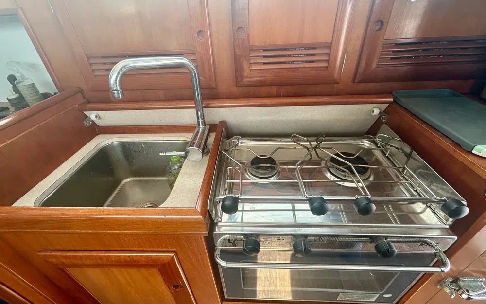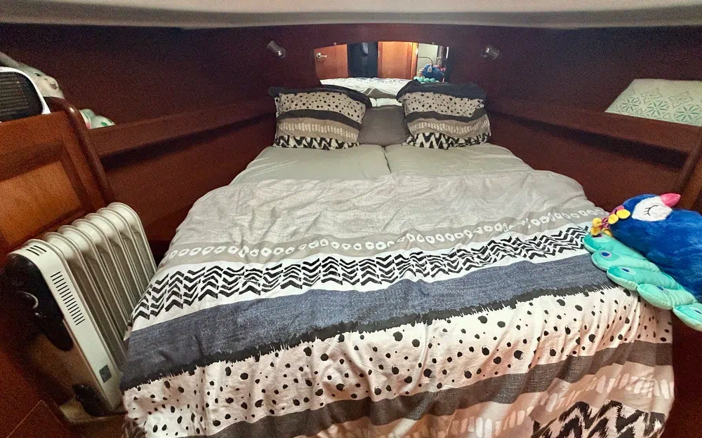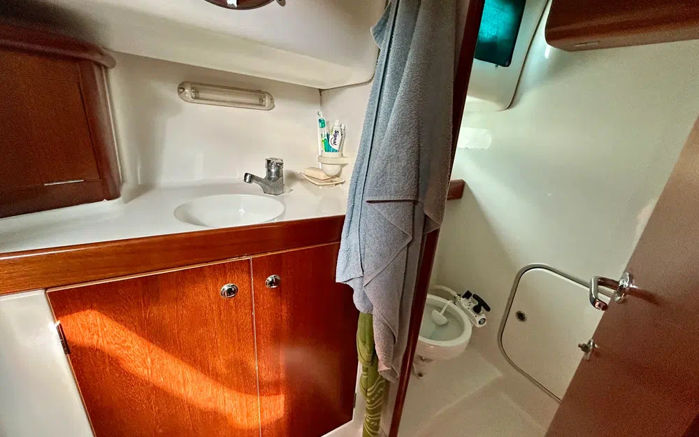 Avec ses 9,99 mètres de long et 3,44 mètres de large, il propose deux cabines, cinq couchages, une salle de bain, une belle habitabilité et une capacité de 10 personnes à bord. La deuxième cabine peut être configurée en deux lits simples ou en un grand couchage double.