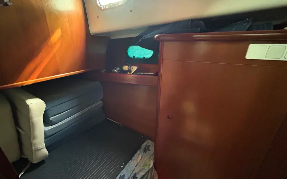 Côté navigation, on retrouve un GPS, radar, pilote automatique, VHF, flaps, sondeur, station météo avec anémomètre, ainsi qu'une table à cartes côté bâbord. L’électronique est d’origine mais fonctionnelle.