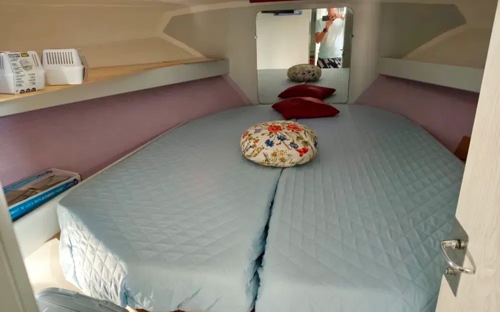 L’intérieur séduit par son volume, sa luminosité et sa fonctionnalité. Le carré est spacieux, bien agencé, avec une sellerie récente et une banquette transformable. La cuisine est entièrement équipée avec plaque de cuisson, évier sous pression, réfrigérateur récent et micro-ondes, offrant de nombreux rangements. Deux cabines séparées permettent de véritables nuits à bord, complétées par une salle d’eau avec WC marin, lavabo et douche. La hauteur sous barrot est confortable, la ventilation naturelle efficace et l’ensemble présente un intérieur sain, prêt à accueillir des croisières prolongées.
