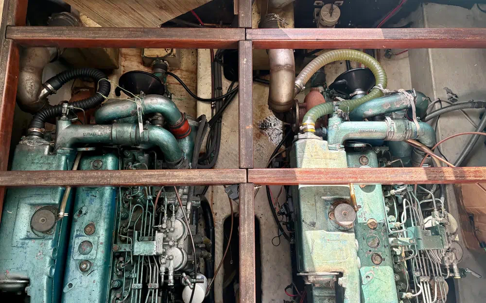 La motorisation repose sur deux moteurs Perkins diesel de 250 chevaux chacun, totalisant environ 2 400 heures. Réputés pour leur fiabilité et leur longévité, ils bénéficient d’un suivi sérieux avec factures à l’appui : turbos remplacés ou reconditionnés, échangeurs neufs, arrivées de gasoil changées, entretien régulier, filtres remplacés et batteries moteur neuves en 2024. La propulsion par lignes d’arbres assure une navigation saine et sécurisante, avec une consommation maîtrisée d’environ 10 litres par heure et par moteur. L’accès aux moteurs se fait directement depuis l’intérieur, facilitant l’entretien courant.