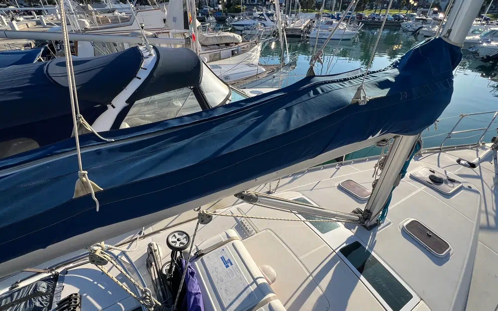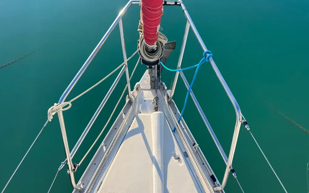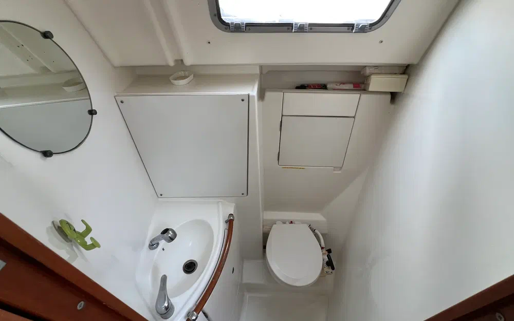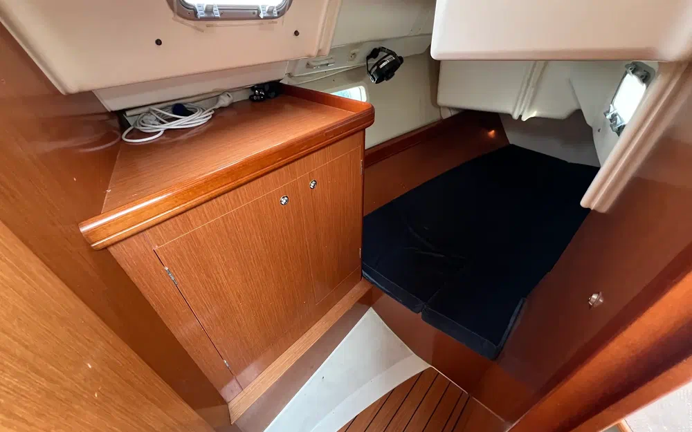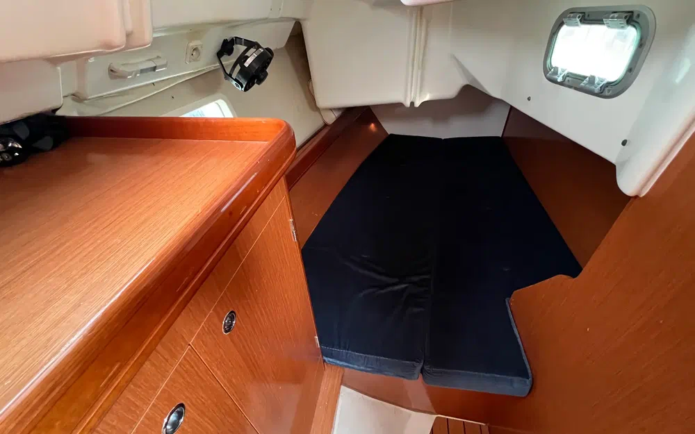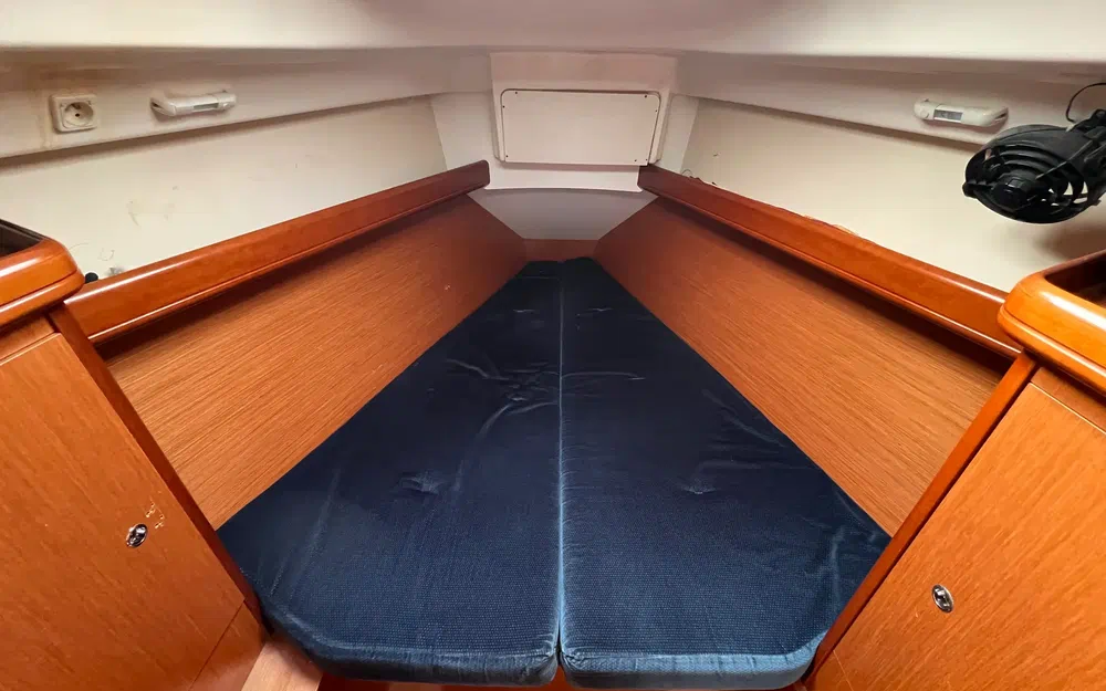 Hauteur sous barrots : 1,86 m. Couchage double triangulaire (2,00 m x 1,66 m x 0,40 m). Nombreux espaces de rangement pour une vie à bord plus facile :