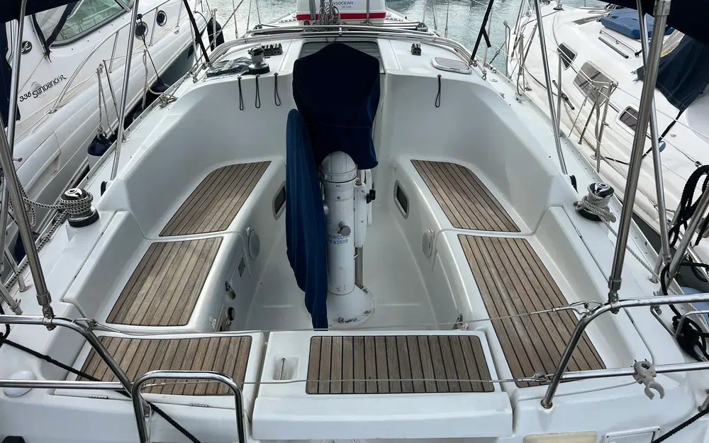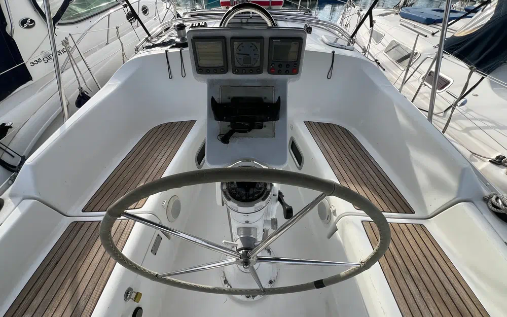 1 coffre à gaz étanche séparé bâbord. Banquettes de cockpit en teck avec lattes. Volant pivotant en inox recouvert de cuir sur colonne. Sur la colonne : 1 compas de barre, levier de commande du moteur, support pour instruments de navigation, rampe de maintien, porte-gobelet. Table de cockpit en teck avec ailes rabattables. Panneau de commande du moteur intégré dans le siège à bâbord. Pompe de cale manuelle dans le cockpit. Les bois sont en bois couleur d'arbre fruitier. Plancher verni "hydropont" avec liserés noirs.