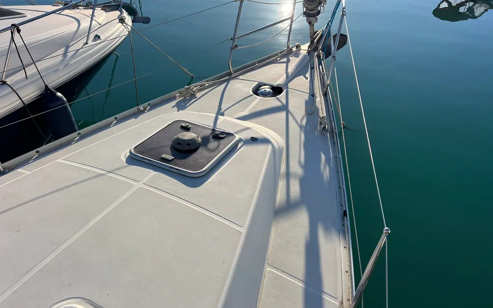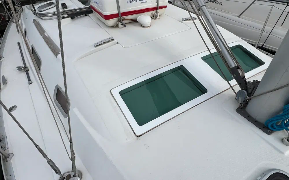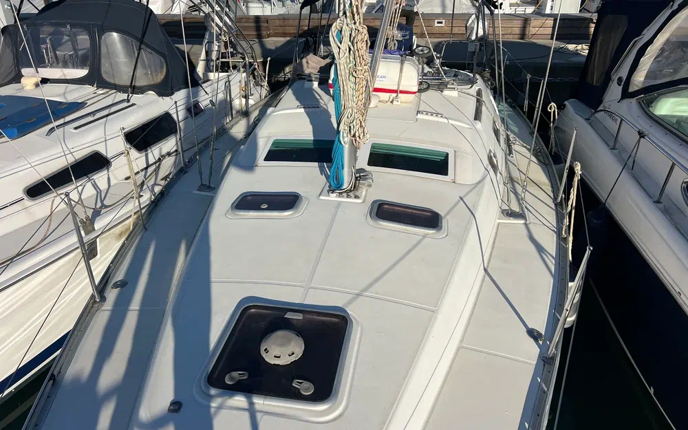 La coque est construite en GRP monocoque. Les points renforcés (quille, gouvernail, platines de haubans, joint coque-pont) renforcent la structure. Un moulage intérieur structurel est collé et laminé à la coque. Son rôle structurel est important, car il absorbe les contraintes aux points de pression (hauban, quille, gouvernail, etc.) et répartit les charges, garantissant une réduction des contraintes sur la coque. Le matériau de surface du moulage intérieur facilite le nettoyage et améliore la finition. L'arbre d'hélice en inox est monté et protégé dans un skeg en GRP. La couleur standard de la coque est blanche avec une livrée bleue et argentée. Le Steel Blue est disponible en option. Le pont est en construction sandwich (fibre de verre et balsa) pour un rapport résistance/poids optimal et une isolation thermique et acoustique. Une surface antidérapante "point diamant" augmente la sécurité dans toutes les zones de déplacement sur le pont.