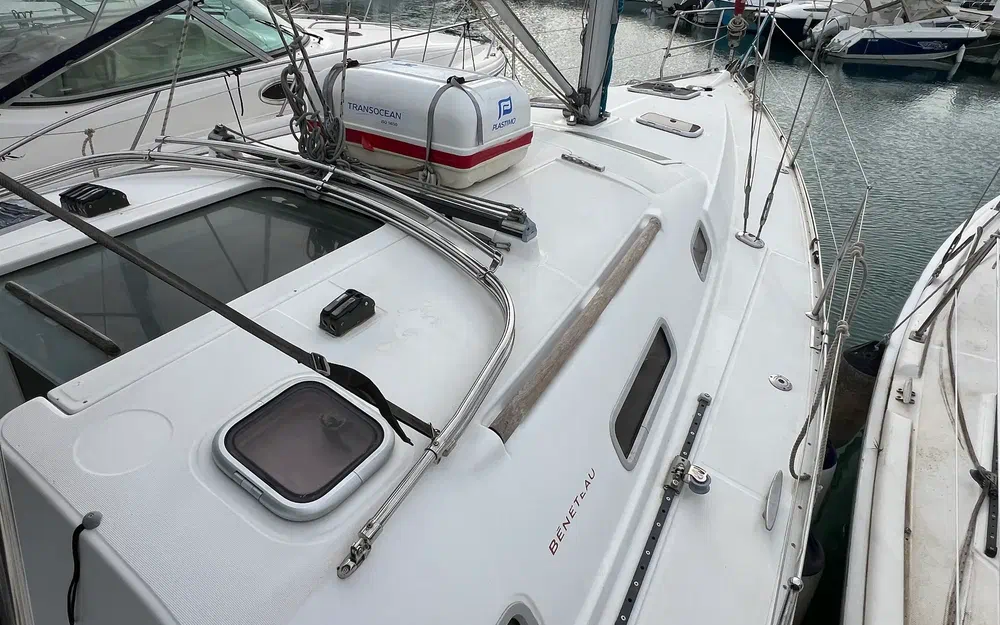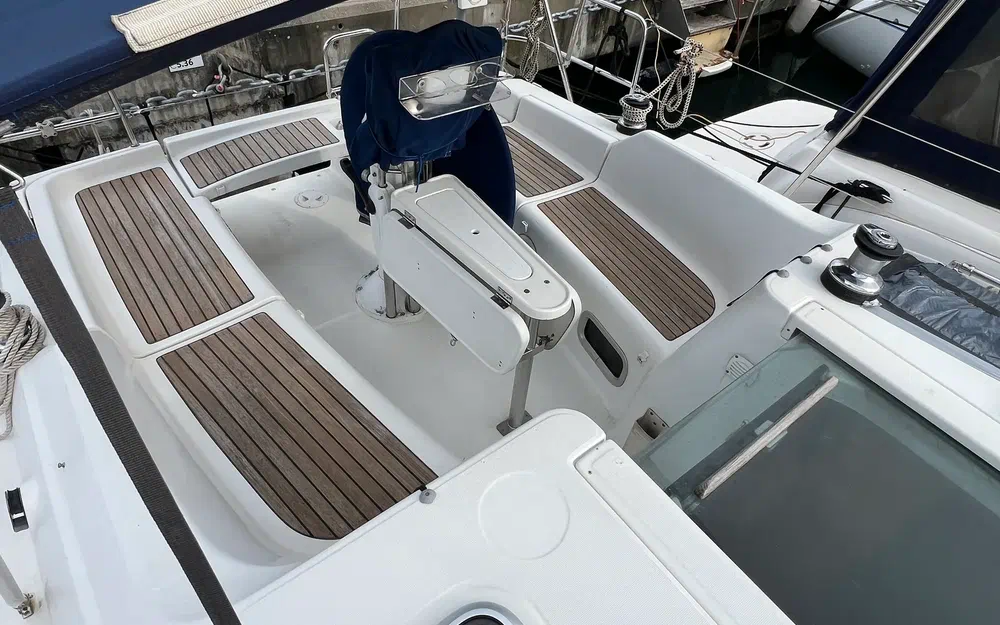 Siège pivotant central du poste de pilotage pour faciliter l'accès à la plateforme de bain. (Brevet Bénéteau). Deux sièges de barre en teck avec lattes de chaque côté du cockpit. Beaucoup d'espace de rangement pour faciliter la vie à bord :