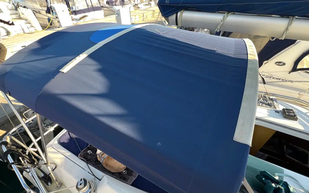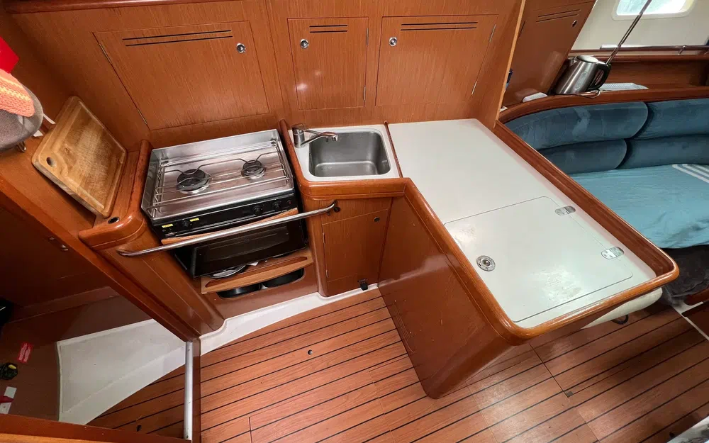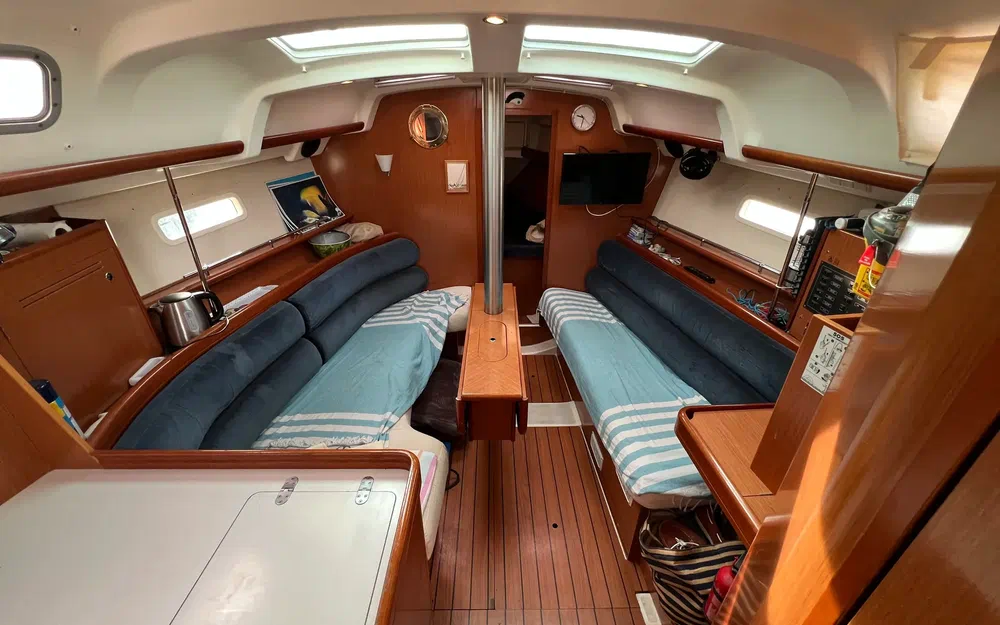 Banquette tribord : 1,76 m x 0,52 m. Les dossiers des banquettes sont inclinés pour plus de confort. Table centrale du salon : table en bois marqueté avec porte-bouteilles et ailes rabattables avec baguettes moulées en bois. La table est fixée au pilier de soutien du mât. Des étagères en bois et inox sont présentes à bâbord et tribord. Rangements :