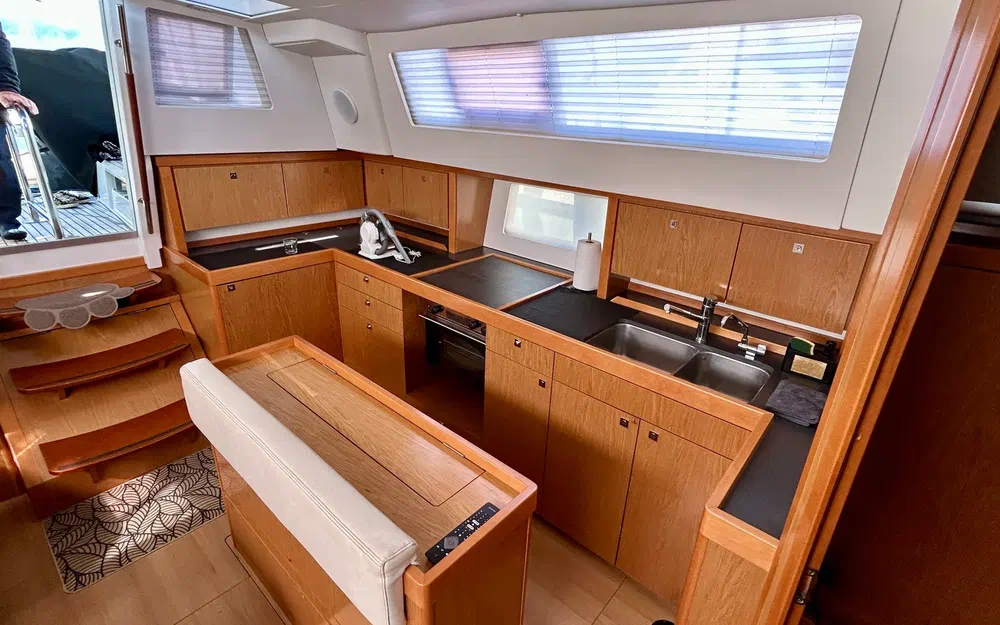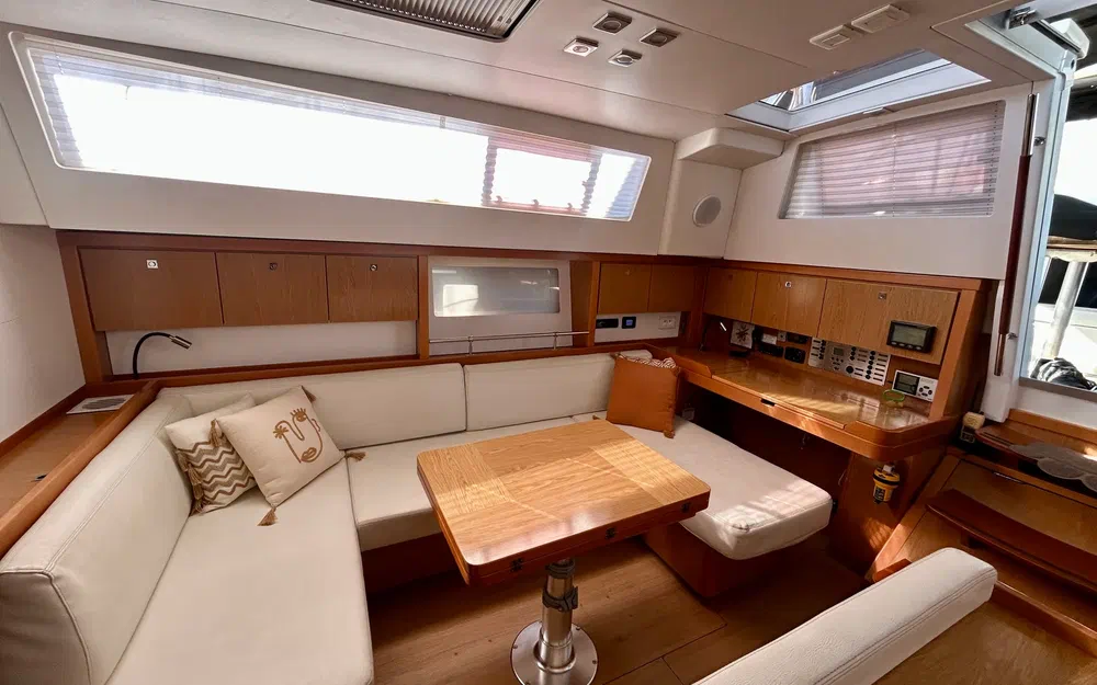 Ce voilier peut accueillir jusqu’à 10 passagers et est composé de 2 cabines + un carré convertible, offrant 5 couchages au total. La salle d’eau moderne est équipée pour un confort optimal à bord. Vous apprécierez le carré transformable, la kitchenette complète (four, cuisinière, réfrigérateur, chauffe-eau, nombreux rangements), la télévision encastrable, et la présence du chauffage ainsi que de la climatisation pour profiter de votre bateau en toute saison.