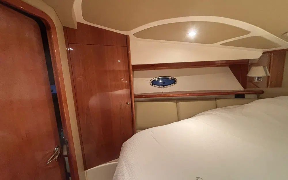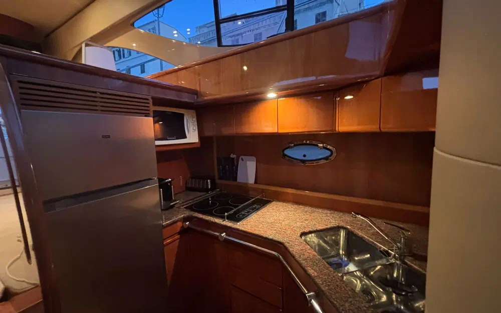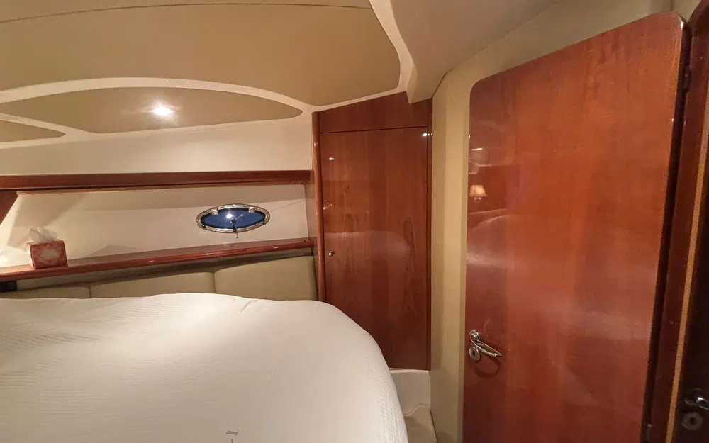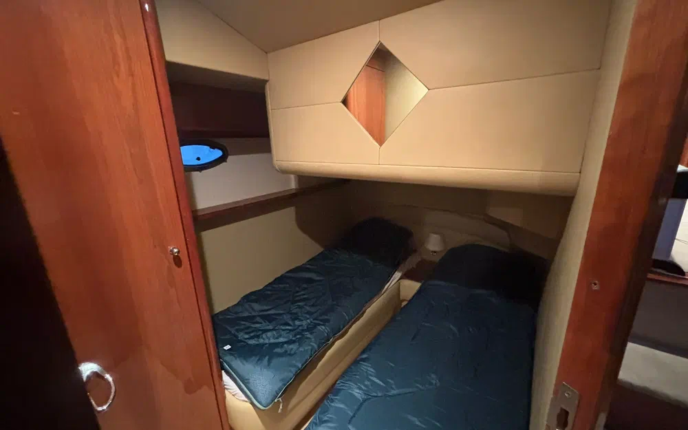 L’aménagement intérieur propose deux cabines confortables permettant d’accueillir quatre personnes, accompagnées de deux salles de bain avec WC électriques. Le carré est spacieux et lumineux, avec une cuisine entièrement équipée comprenant réfrigérateur, micro-ondes, évier et cuisinière. La climatisation réversible assure un confort optimal quelle que soit la saison.