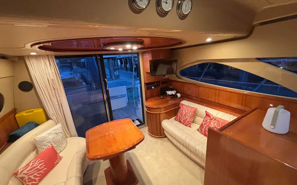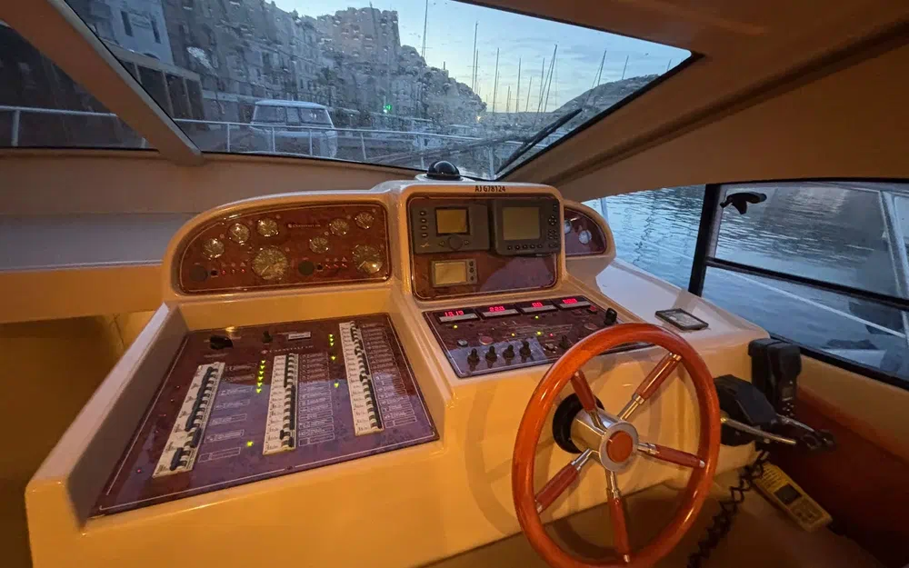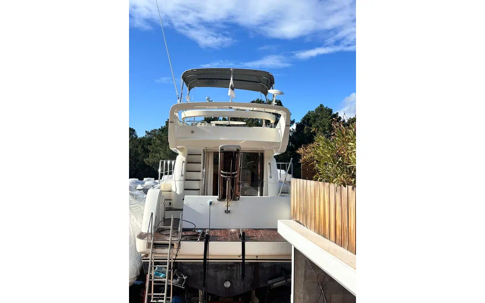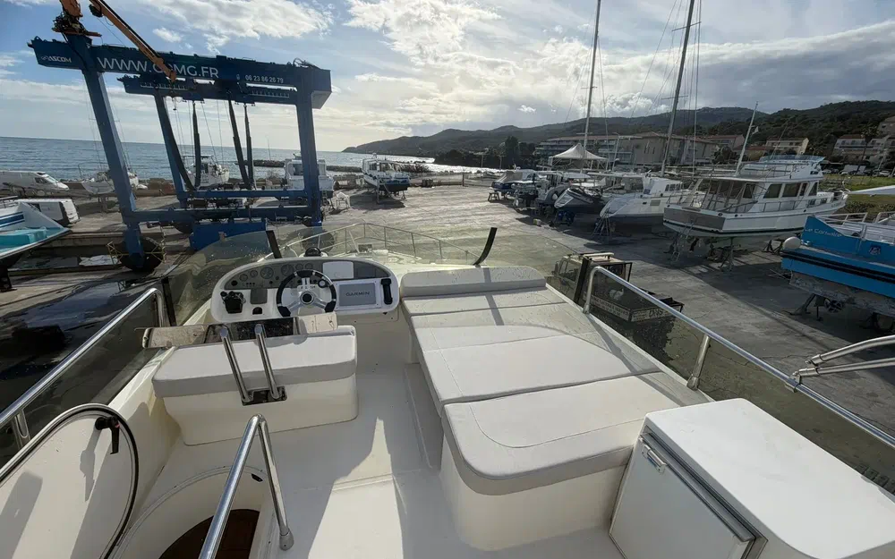 Les espaces extérieurs sont particulièrement bien pensés. Le cockpit arrière dispose d’une table et de banquettes favorisant la convivialité. À l’avant, un bain de soleil permet de profiter pleinement du mouillage. Le flybridge, doté de selleries neuves, constitue un véritable espace de vie supplémentaire. La plateforme arrière, associée à une échelle de bain et une passerelle hydraulique, facilite grandement les accès à bord et les activités nautiques.