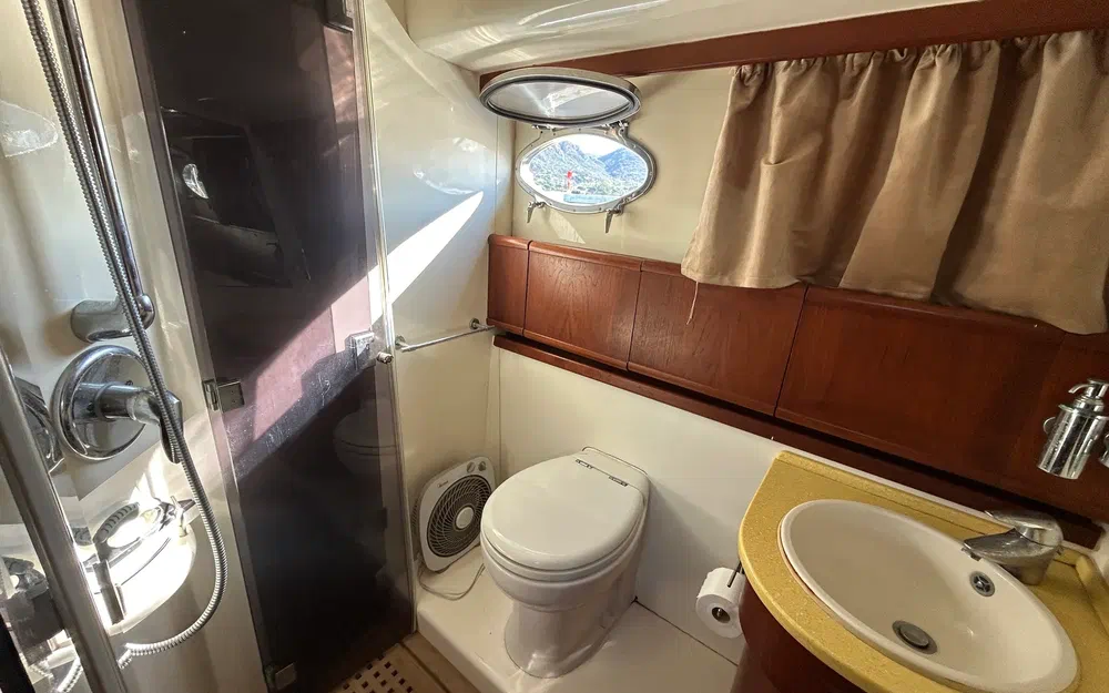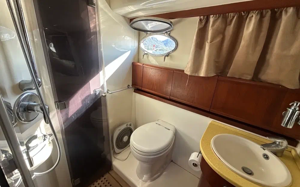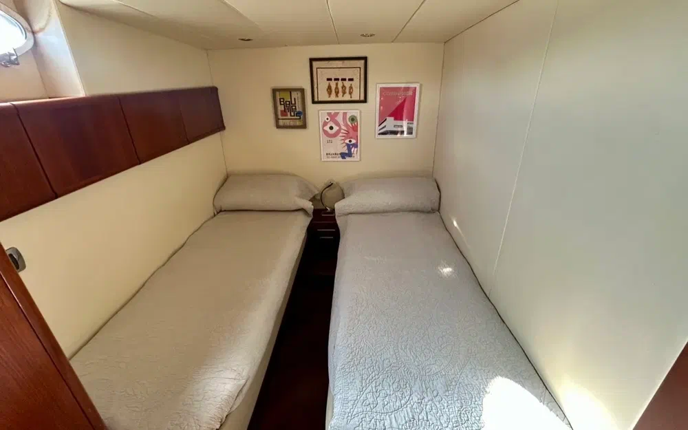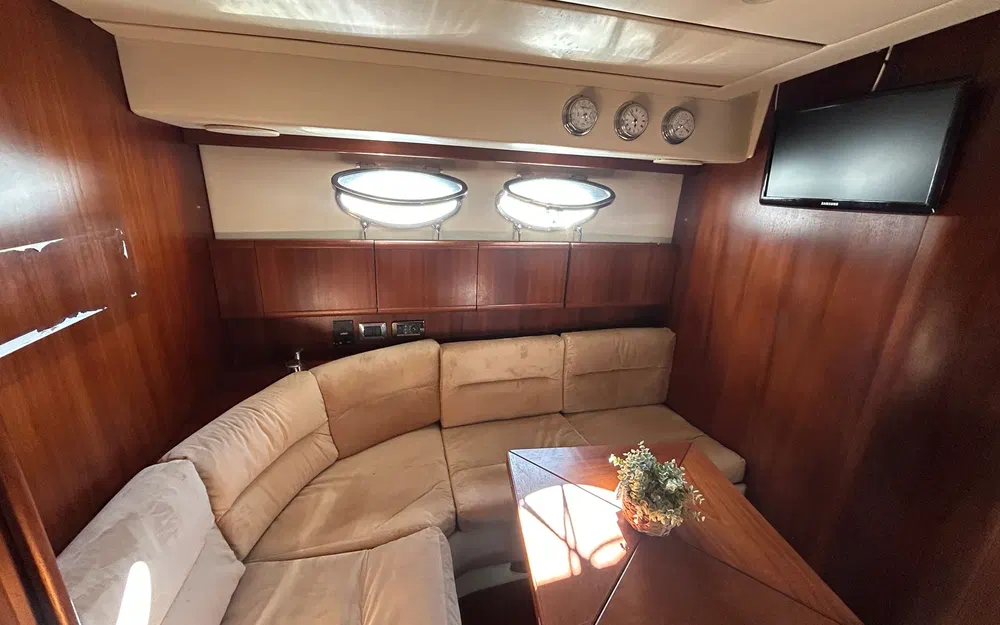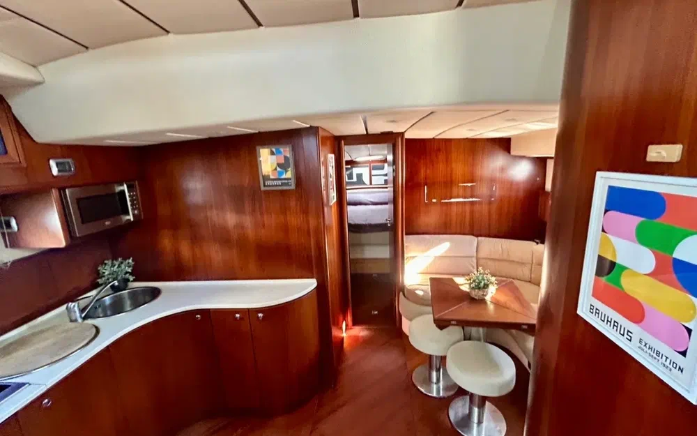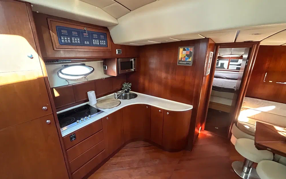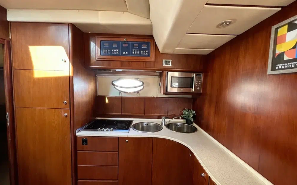 À l’intérieur, le carré offre une atmosphère chaleureuse grâce à ses boiseries, avec un agencement confortable comprenant trois cabines ainsi qu’une cabine équipage. Les volumes sont bien répartis, permettant d’accueillir famille et invités dans un cadre agréable. La cuisine intérieure est complète et fonctionnelle, parfaitement intégrée à l’espace de vie.