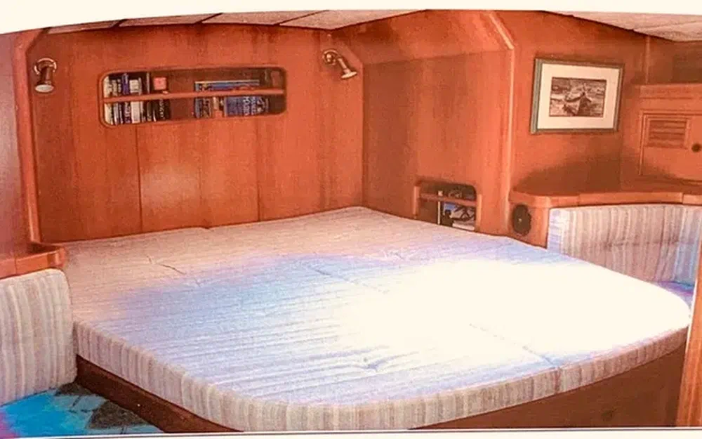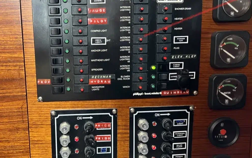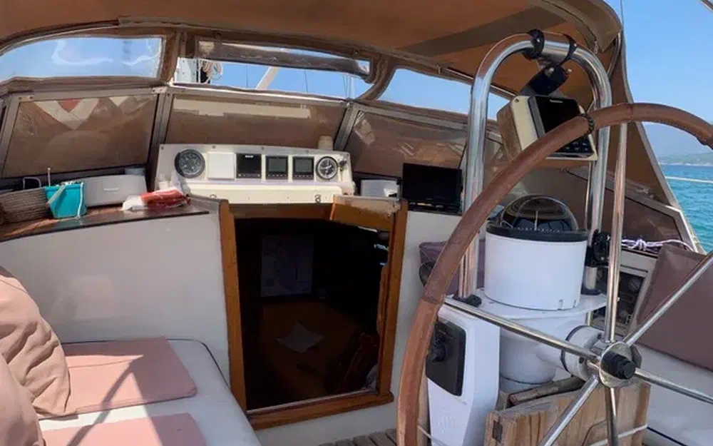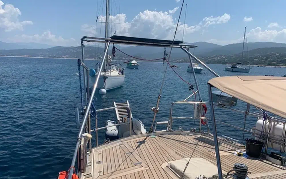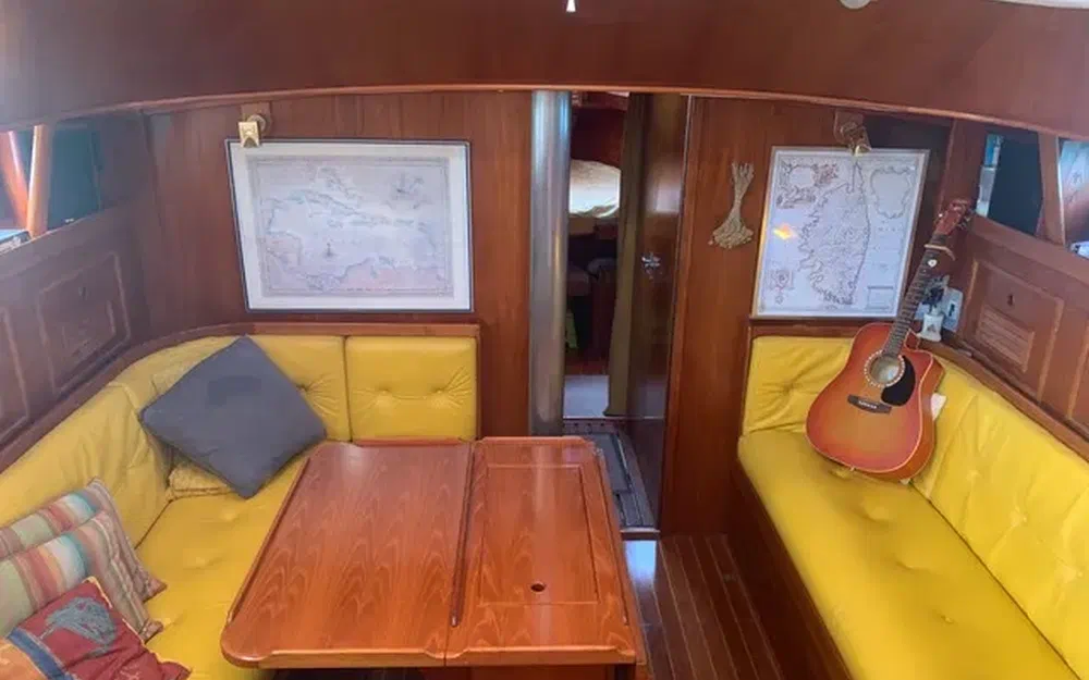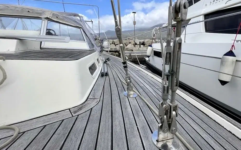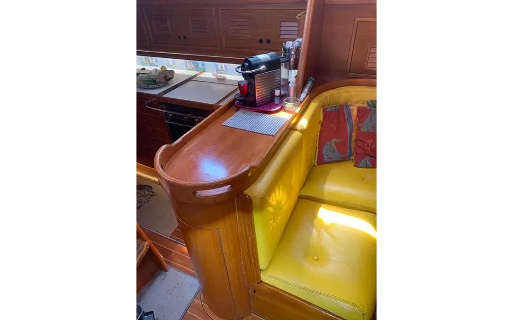 Construction robuste, alliant confort a la barre et vie à bord, il a été équipé pour un équipage réduit (et meme solo), toutes les commandes reprises au cockpit central, enrouleur de Grand Voile et de Génois à commande hydraulique Reckmann, winchs électriques, entièrement équipé pour la croisière et en autonomie au mouillage.