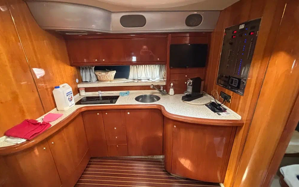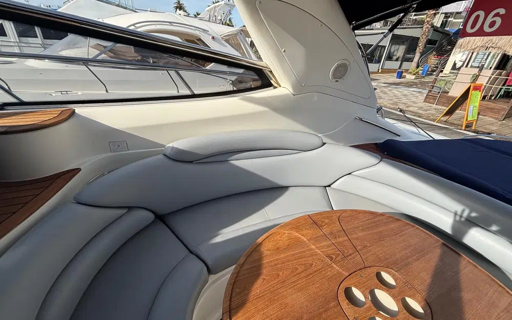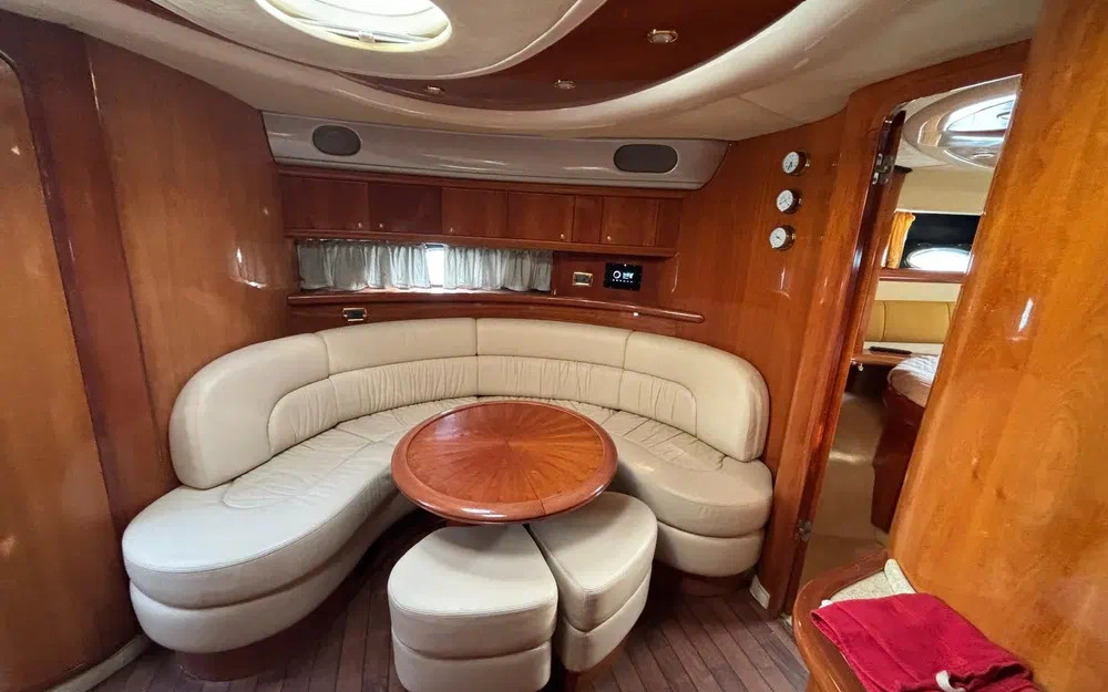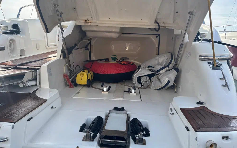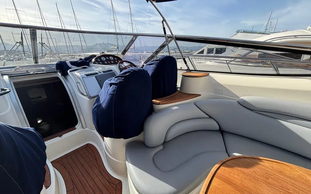 À bord, tout a été pensé pour le confort : 3 cabines, 6 couchages, 2 salles de bain, une sellerie extérieure grise en très bon état, protégée par des housses bleu marine. Le pont en teck, le garage à tender, la passerelle hydraulique et les coussins bain de soleil complètent un équipement de pont haut de gamme. La cuisine extérieure (kitchenette avec évier et réchaud) ainsi que la cuisine intérieure (micro-ondes, cuisinière, réfrigérateur, machine à glaçons, cafetière) garantissent une parfaite autonomie à bord.