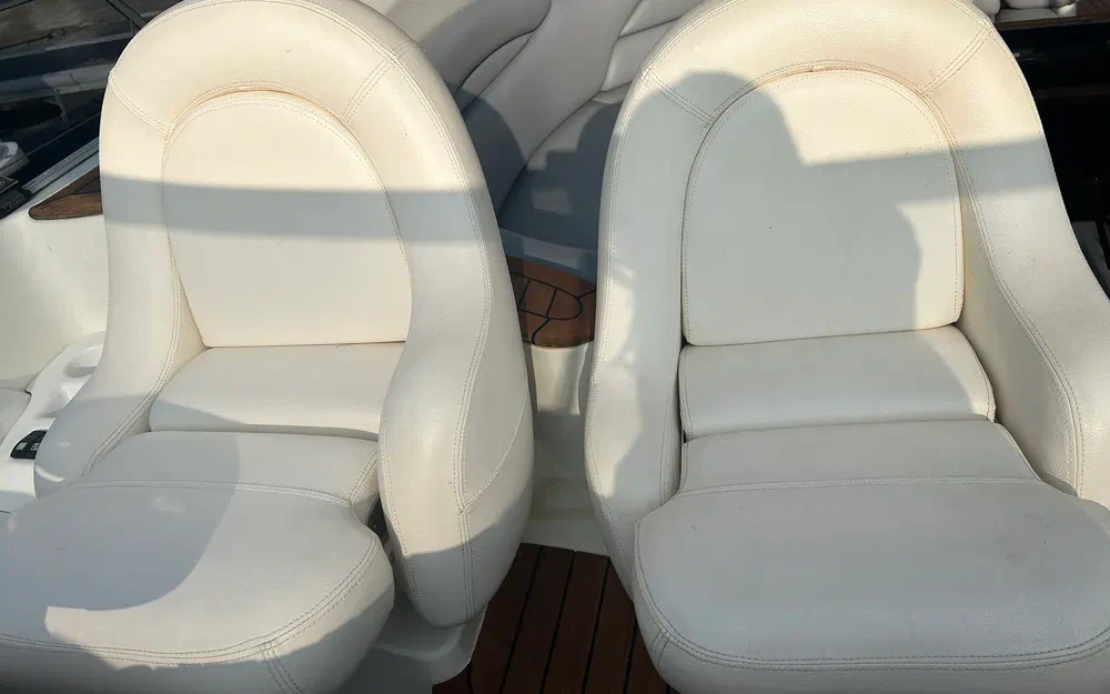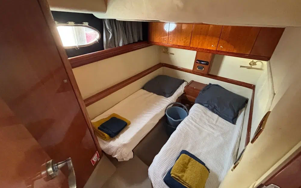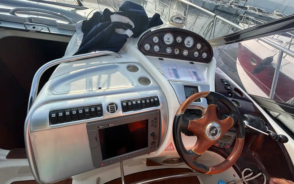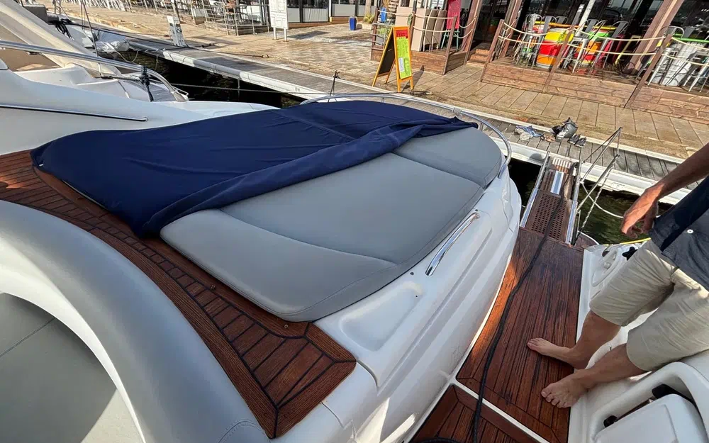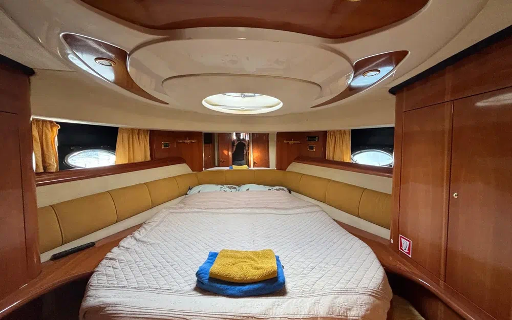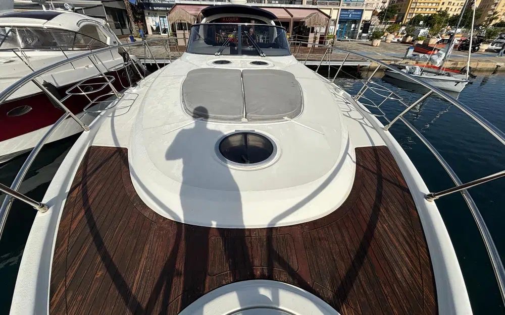 À bord, tout a été pensé pour le confort : 3 cabines, 6 couchages, 2 salles de bain, une sellerie extérieure grise en très bon état, protégée par des housses bleu marine. Le pont en teck, le garage à tender, la passerelle hydraulique et les coussins bain de soleil complètent un équipement de pont haut de gamme. La cuisine extérieure (kitchenette avec évier et réchaud) ainsi que la cuisine intérieure (micro-ondes, cuisinière, réfrigérateur, machine à glaçons, cafetière) garantissent une parfaite autonomie à bord.