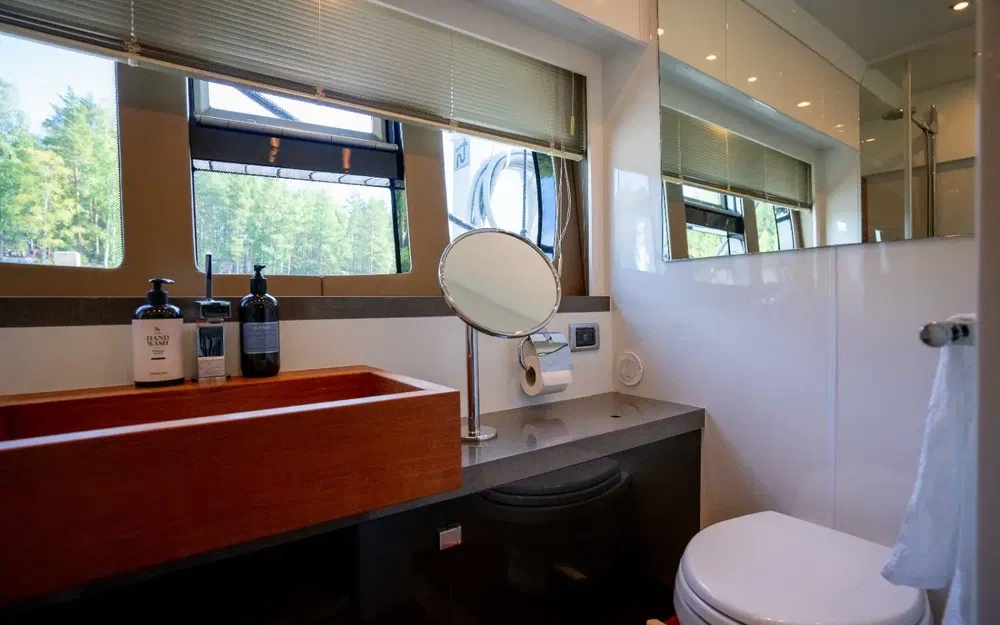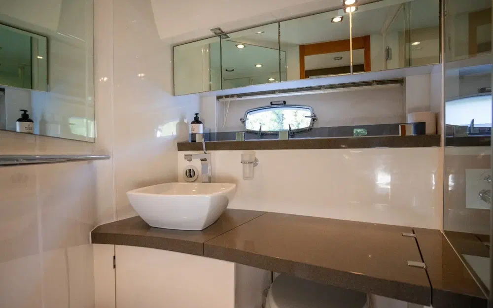 La cabine pleine largeur du propriétaire est équipée d'une salle de bains attenante. Bonne hauteur sous barrot dans toute la cabine.