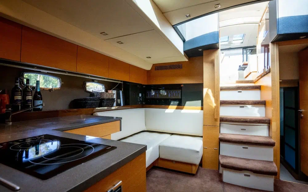 Sur le pont inférieur se trouve un coin repas avec une cuisine ouverte entièrement équipée.