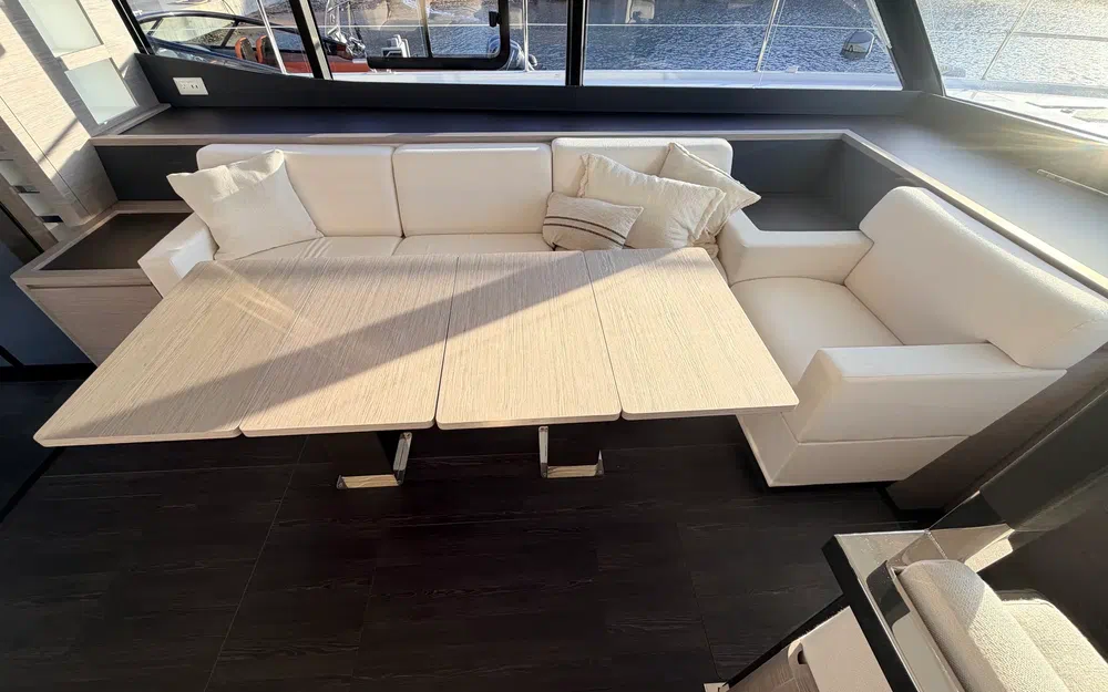 Le salon principal, baigné de lumière naturelle, propose deux larges sofas face à une vue panoramique sur la mer. La table centrale hydraulique permet de moduler l’espace selon les usages, du déjeuner décontracté au dîner élégant.