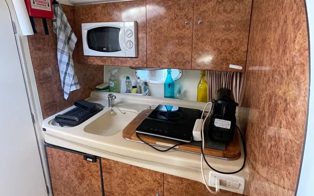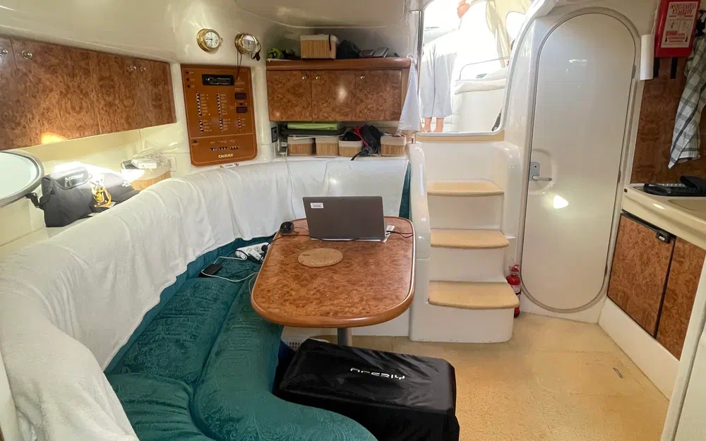 Le bateau dispose d’un carré transformable, d’une cuisine équipée (réfrigérateur intérieur et extérieur, cuisinière Origo), d’une salle d’eau avec WC et douche, ainsi que d’une Smart TV compatible 12V et 220V.