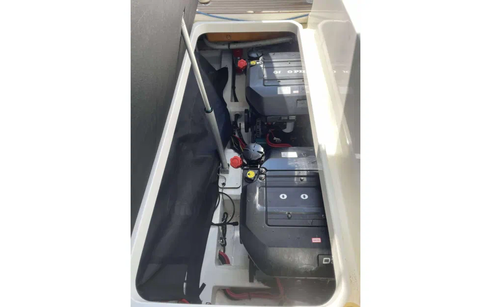 Le bateau est équipé d’un propulseur d’étrave, d’un joystick, d’un ensemble électronique Raymarine comprenant GPS, traceur et radar, ainsi que d’un guindeau électrique. La prise de quai 220 V et la sellerie extérieure complètent un équipement cohérent et recherché sur le marché de l’occasion.