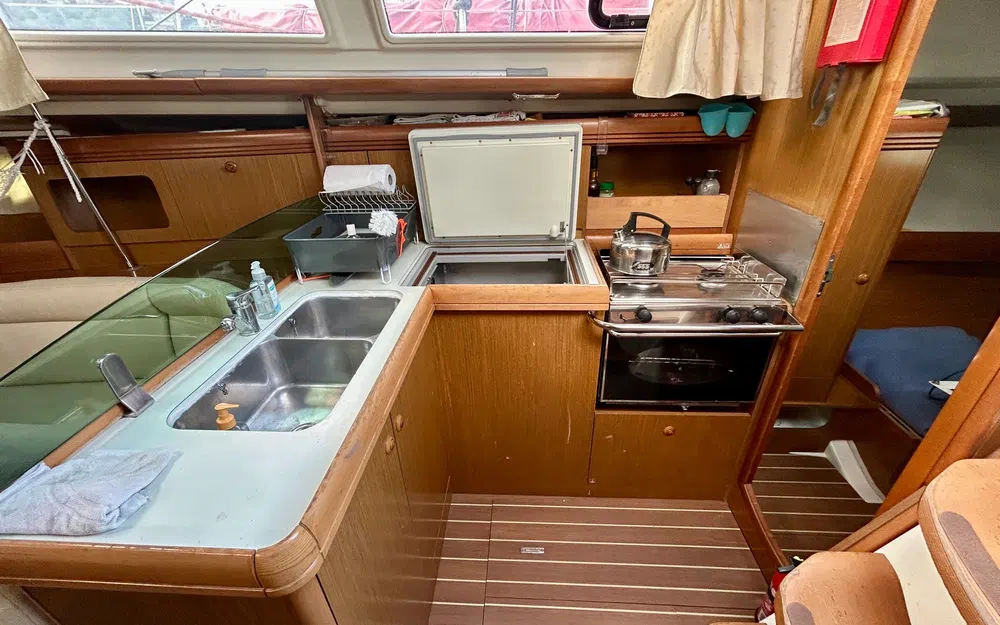 L’intérieur est particulièrement soigné, avec une sellerie beige en excellent état, des boiseries et vaigrages impeccables, et un éclairage LED moderne. Il propose trois cabines doubles, un carré lumineux avec table à cartes modulable (sur rail !), une cuisine en L équipée (réfrigérateur, four, gazinière sur cardans, double évier), une table à cartes sur rail, ainsi qu’une salle d’eau avec WC marin et réservoir d’eaux noires.