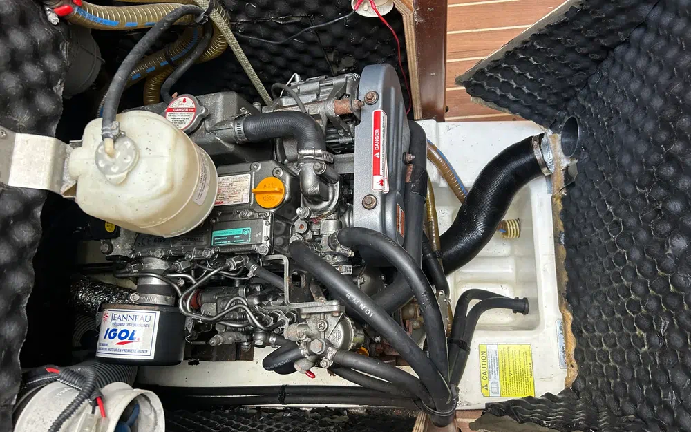 Ce voilier est équipé d’un moteur in-board diesel Yanmar de 29 CV, totalisant environ 1250 heures, avec un entretien annuel rigoureux. Le réservoir de carburant est de 130 litres, offrant une bonne autonomie.