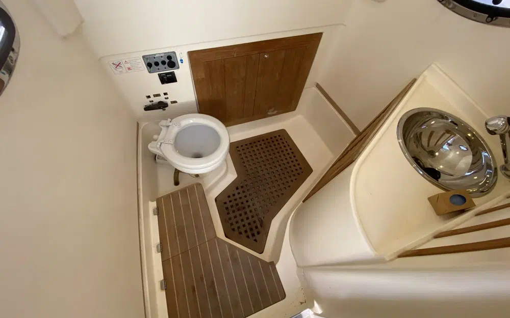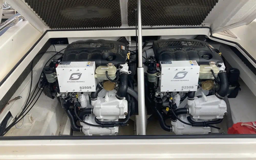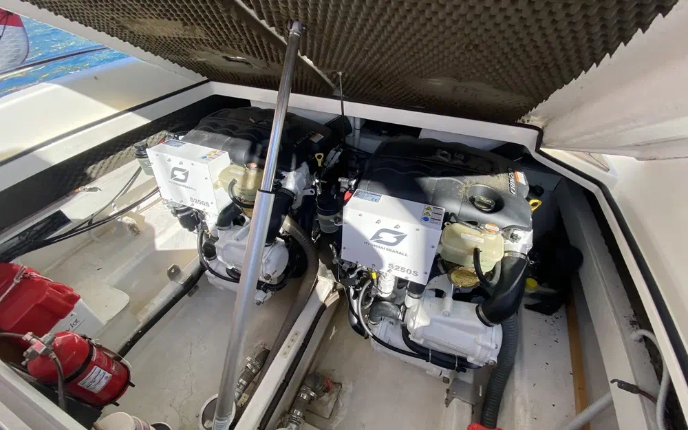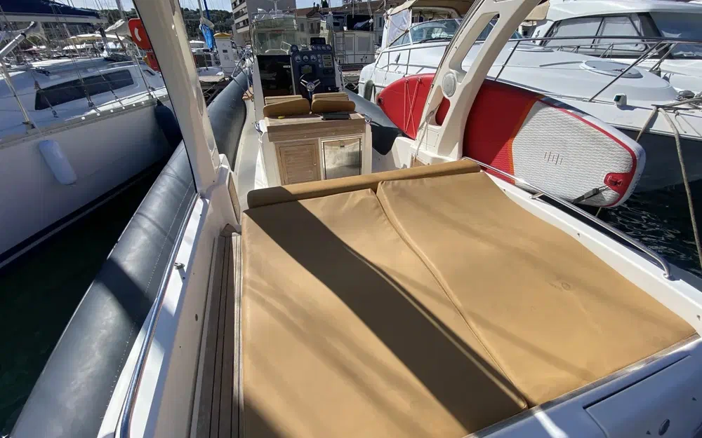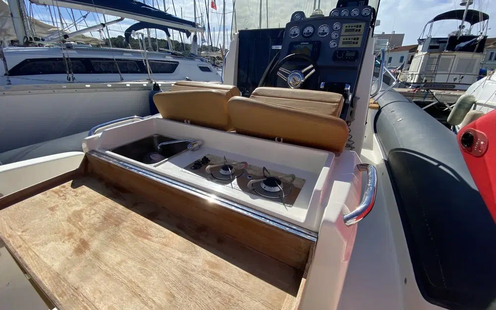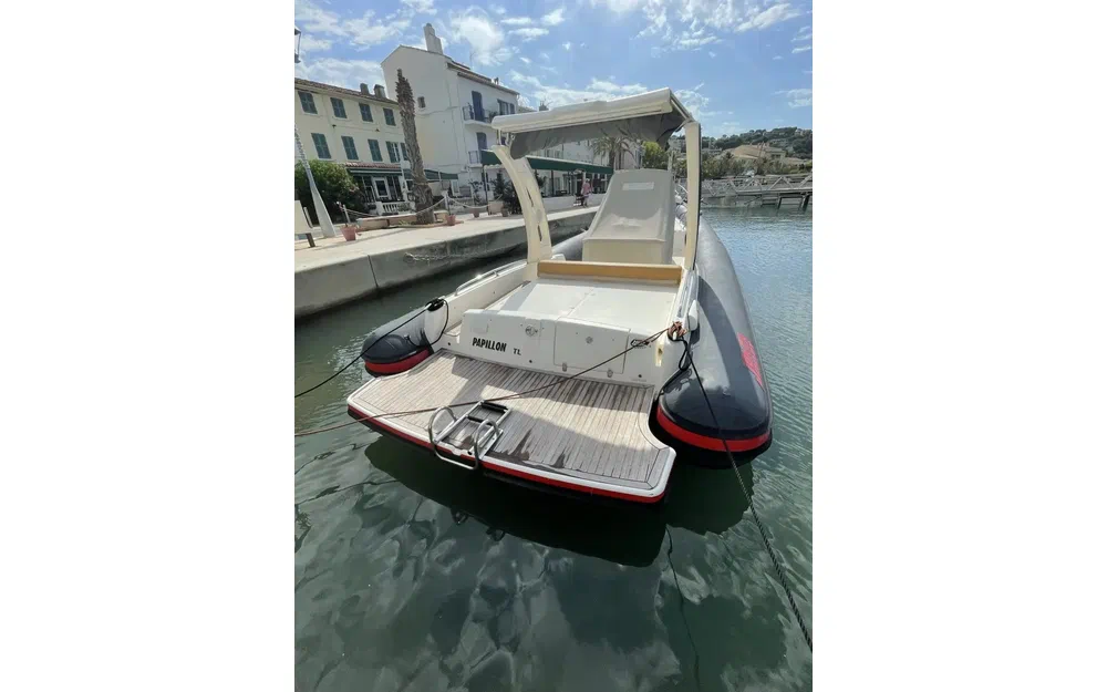 Nouvel amiral de la flotte Joker Boat depuis sa présentation au dernier salon de Gênes, le 33 Mainstream peut faire la fierté du constructeur italien : avec 10 m de long et 3, 63 m de large, cette luxueuse unité en impose. En prenant les commandes de ce modèle vous pouvez être sûr d'une chose : arriver incognito dans un port ou un mouillage est un pari perdu d'avance ! Mais si l'on est loin du concept traditionnel du pneu léger et transportable, le 33 Mainstream est tout de même un authentique semi-rigide, avec les avantages de stabilité, de sécurité et de capacité en passagers propres à ce type de bateau. Joker Boat le décline en deux versions : hors-bord ou diesel in-board, en l'occurrence celle que nous essayons aujourd'hui. Avantages de celle-ci : solarium arrière beaucoup plus grand, vaste plage de bain arrière en teck, sobriété des diesels. Avantages de la version hors-bord : performances supérieures, soute arrière. Histoire de se mettre dans l'ambiance, commençons par un petit tour du propriétaire avant de lancer les Hyundai V6 250 ch qui dorment sous le pont arrière. Outre l'impressionnante surface du cockpit, on aime le design contemporain et sobre de ce modèle, et sa classe sans ostentation. Le flotteur est, bien sûr, en néoprène-hypalon de 1 670 décitex (Orca de Pennel-Flipo), couleur ivoire, souligné par un double liston de protection sur toute la périphérie. Dans le cockpit, les selleries blanches et ocres et les éléments de teck massif sur fond de gel-coat blanc s'accordent parfaitement avec les tons du flotteur. Aucune faute de goût sur cet ensemble à la facture impeccable. On peut aussi louer l'équipement standard, complet et de haute qualité, avec deux douches (intérieur-extérieur), WC électrique, selleries et bains de soleil complets, guindeau électrique avec ancre inox, cuisine équipée (frigo, feux gaz, évier), etc. Les détails importants ne sont pas oubliés, à l'exemple des points de grutage avec sangles fournies. Le taud de soleil est pratiquement la seule option à ajouter. Le pont révèle son orientation méditerranéenne, tendance farniente, avec deux vastes bains de soleil, à l'avant et à l'arrière, où une coursive latérale ménage un accès pratique à la superbe plate-forme de bain en teck. Au centre du cockpit la volumineuse console de pilotage abrite une grande salle d'eau (douche-lavabo-WC et 1,87 m de hauteur), bien aérée par deux hublots. Pas de cabine sur ce 10 m qui, tel quel, est plutôt un day-boat de luxe qu'un croiseur au long cours. La croisière est pourtant en ligne de mire, grâce à la cuisine intégrée à l'arrière du leaning-post, avec table de pique-nique dépliable. En ajoutant un taud de camping intégral (ou deux indépendants, sur l'avant et l'arrière), les bains de soleil se convertiront en deux lits/cabines confortables. Ainsi équipé, le 33 Mainstream pourra embarquer en croisière quatre adultes ou deux adultes et trois enfants. En balade à la journée, il accueille volontiers un équipage plus nombreux. L'optimum est de six à huit passagers, compte tenu d'une conception qui favorise plutôt le confort exclusif en petit comité que le transport en groupe, même si la capacité maximale autorisée est de 20 personnes. Assurément, c'est une superbe unité, dont on attend logiquement des qualités marines en rapport. Sur ce point, c'est avec optimisme que je m'installe aux commandes : le 33 Mainstream hérite en effet de l'excellente carène du Clubman 33, avec lequel j'avais enregistré 55 n?uds stabilisés sur du gros clapot, lors d'un essai mémorable avec deux V8 350 ch Yamaha (Pneu Mag n°69). J'aborde donc cet essai avec curiosité, sachant que les diesels de 250 ch, quelle que soit leur valeur, ne peuvent en donner autant. Avouons-le tout de suite, ce sera plutôt une bonne surprise, mais commençons par le commencement, à savoir le poste de pilotage, bien abrité derrière la haute console que surmonte un large pare-brise. Le leaning-post y procure un appui confortable, le volant et les commandes sont à la bonne hauteur et ?tombent? bien sous les mains, la direction hydraulique assistée est précise (3 tours et demi de butée à butée). Seul bémol, sous certains éclairages la console blanche se reflète sur l'intérieur du pare-brise, teinté et très incliné (on apprécierait un traitement anti-reflet du haut de console). À l'arrière, les nouveaux diesels 6 cylindres Hyundai Marine (identiques à ceux qui équipent en automobile le plus gros 4x4 de la marque coréenne) font preuve d'une discrétion exceptionnelle, et ceci à tous les régimes (à peine 62 dB à pleins gaz, là où tous les hors-bords affichent 85 à 90 dB).Pas de grand frisson au déjaugeage (on serait surpris du contraire avec des diesels), mais le chrono de déjaugeage (4,8 secondes) n'a rien de poussif, même s'il reste loin des 3,2 secondes enregistrées avec des 350 ch Yamaha. Et les 5,8 secondes pour atteindre 20 n?uds sont plus qu'honorables. En poussant sur la manette des gaz, je retrouve les superbes impressions de pilotage de l'ex-Clubman 33, les diesels Hyundai s'avérant franchement plus punchy qu'attendu. Deux sensations dominent à tous les régimes : équilibre de la carène et sécurité absolue. On en apprécie d'autant plus la remarquable précision de la direction assistée qui délivre un pilotage très vivant, surprenant même au regard des 3,5 T de ce modèle. En ligne droite rapide la carène reste sur des rails quelle que soit la vitesse, avec un confort absolu. En courbe rapide, elle délivre une légère sensation de survirage sans faire craindre de dérapage. Et si l'on resserre franchement le rayon, elle vire facilement sur 20 m à 25-28 n?uds. Bref, le comportement ce bateau procure un pilotage particulièrement agréable et vivant, auquel vient s'ajouter l'atout maître de cette motorisation, son rendement exceptionnel en vitesse de croisière. À 25-30 n?uds, l