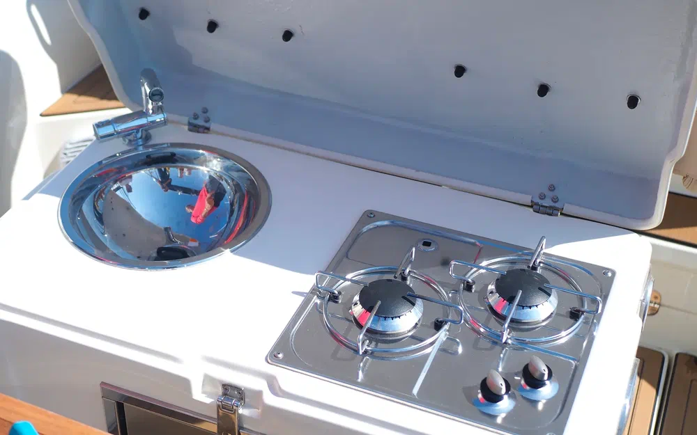- Cuisine extérieure avec évier, réchaud 2 feux et frigo