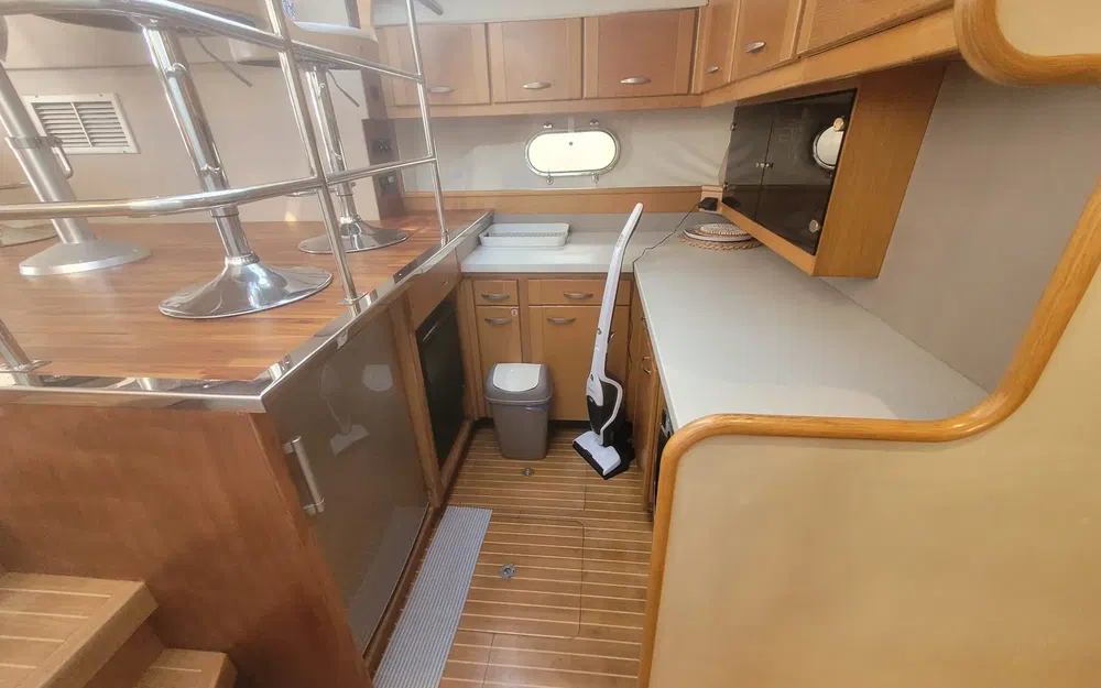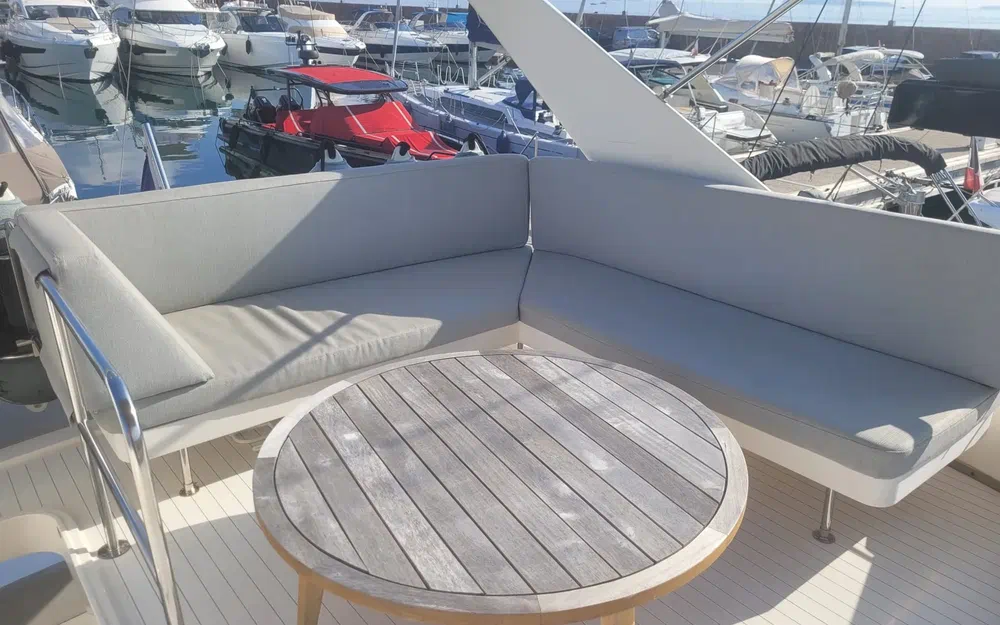 Dès l’embarquement, on découvre des volumes généreux et une circulation fluide, aussi bien à l’intérieur qu’à l’extérieur. Le cockpit, prolongé par une plateforme de bain en teck et une passerelle hydraulique, invite naturellement à la vie au mouillage. Le flybridge, spacieux et convivial, offre un excellent poste de pilotage et un espace détente idéal pour les navigations estivales.