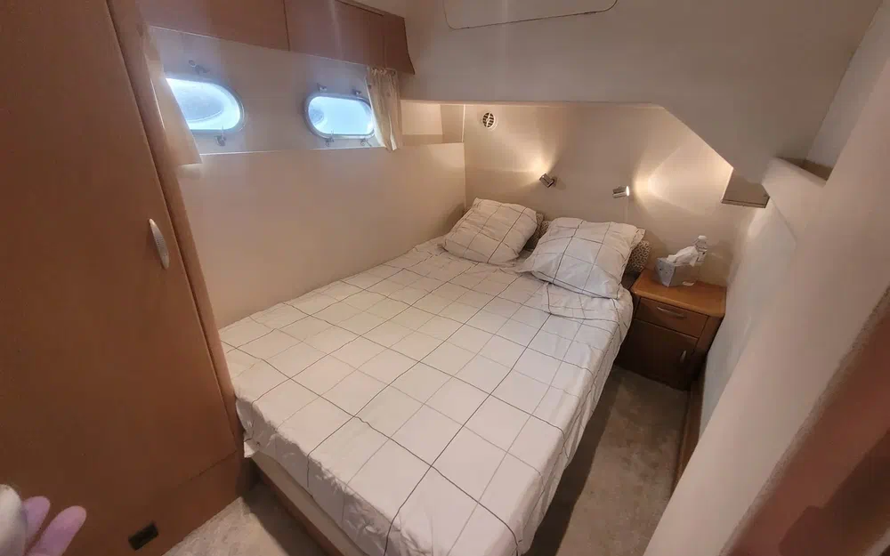 La carène éprouvée du Princess 55, associée à une motorisation bi-moteur Volvo Penta TAMD 122 D de 480 chevaux chacun, assure une navigation stable, rassurante et confortable. La vitesse de croisière recommandée d’environ 18 nœuds permet de longues traversées en toute sérénité. Les propulseurs d’étrave et de poupe, combinés aux flaps, rendent les manœuvres simples et précises, même en équipage réduit.