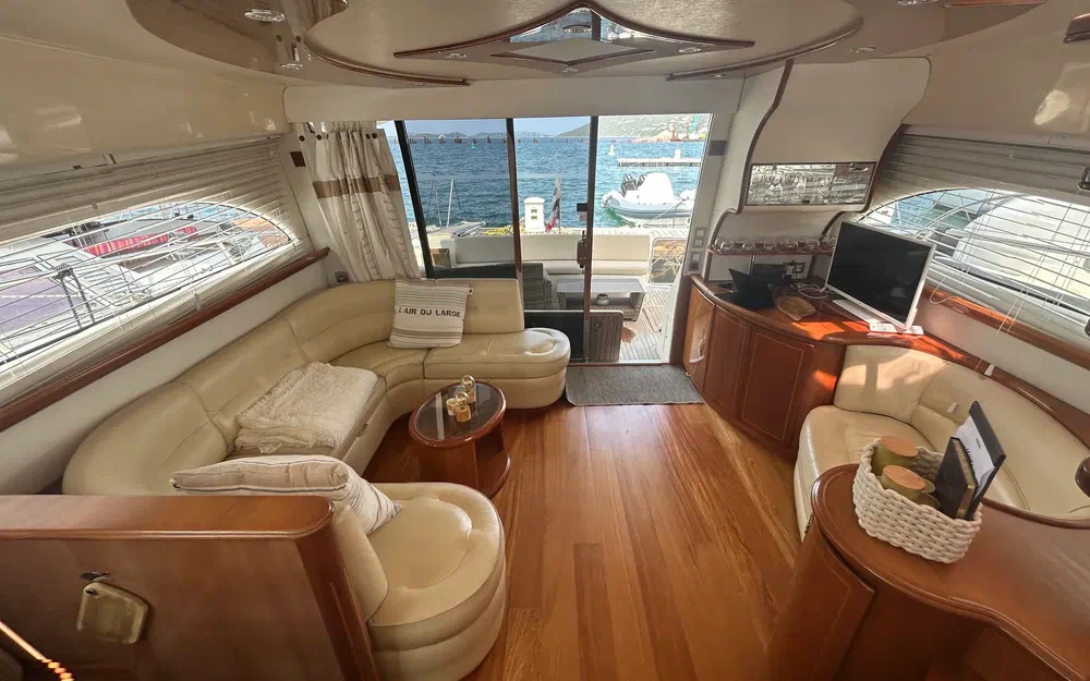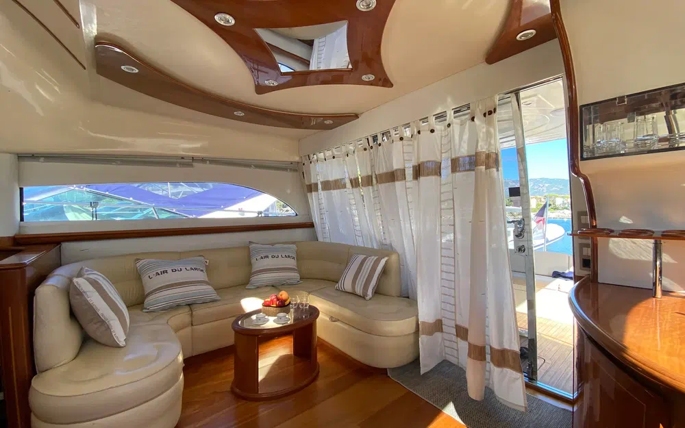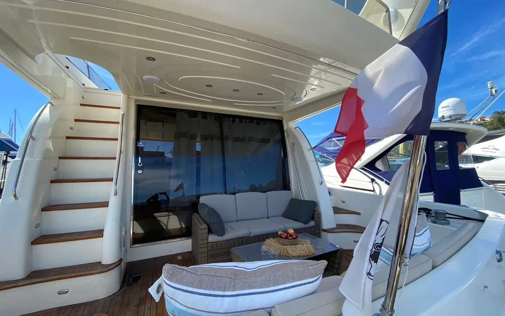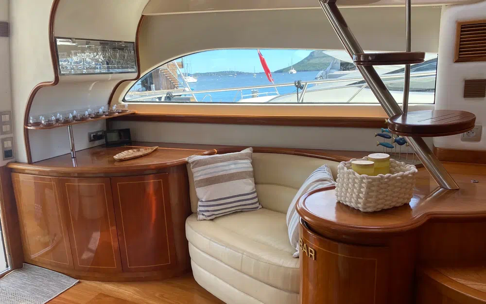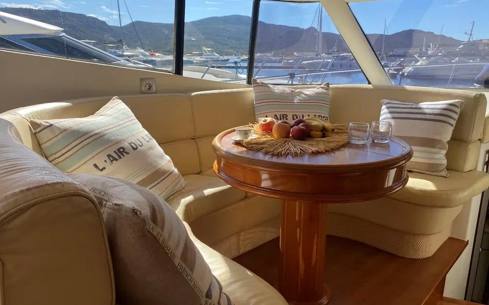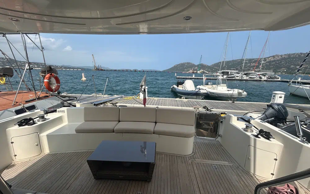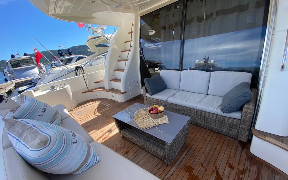 Plateforme arrière en teck avec salon extérieur pour apéros ou dîners en mer