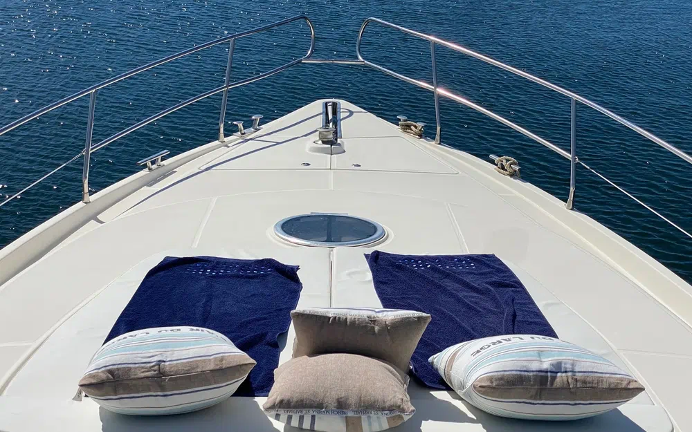 Bains de soleil avant et sur le fly, avec housses éponges