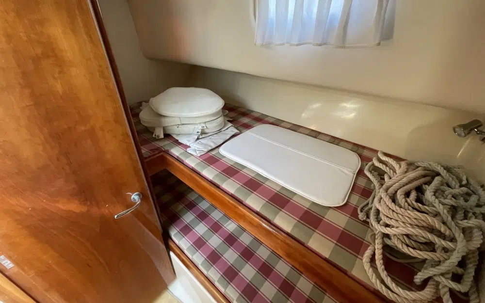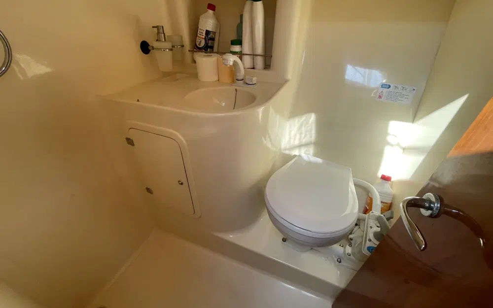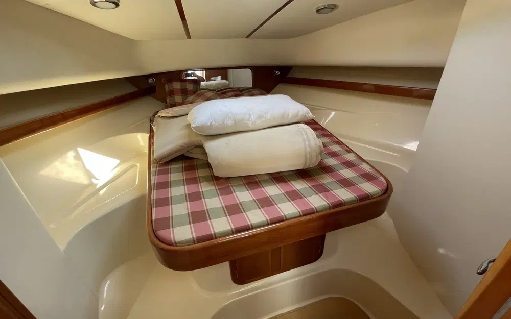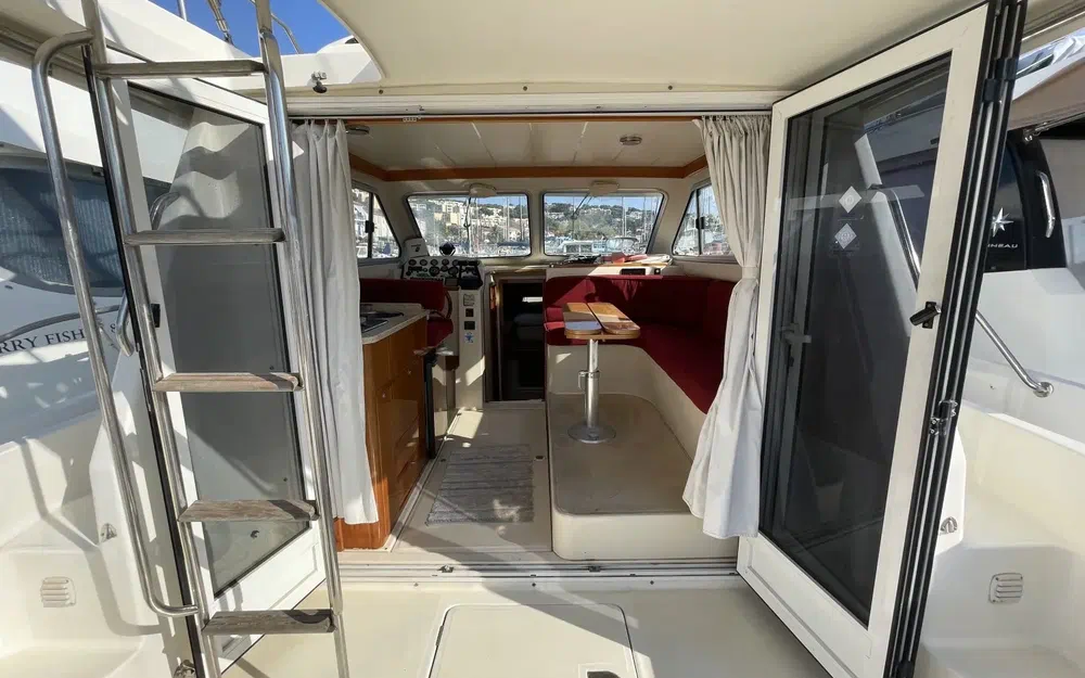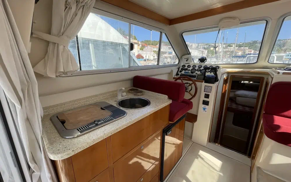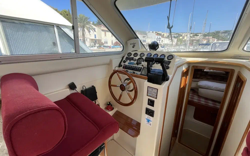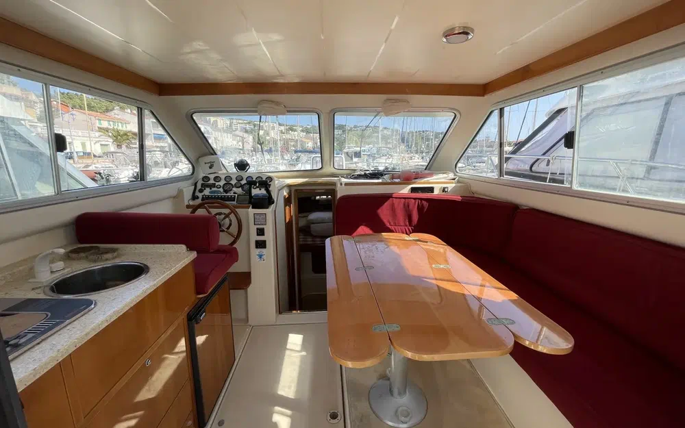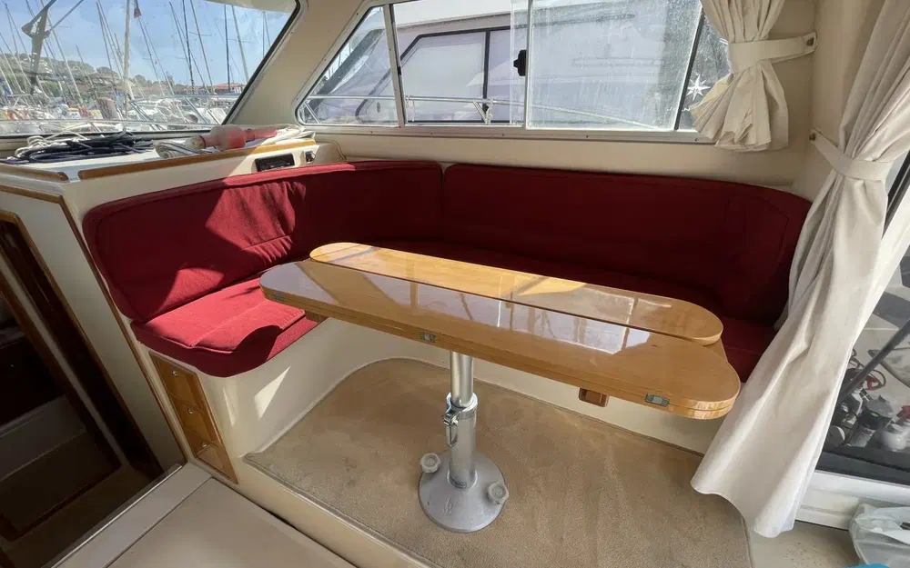 L'intérieur du Rodman 900 est en très bon état, alliant confort et fonctionnalité. Les boiseries sont impeccables, soigneusement entretenues, offrant une atmosphère chaleureuse à bord. La sellerie, de couleur bordeaux, apporte une touche élégante et chaleureuse à l'espace intérieur. Cette couleur vive contraste magnifiquement avec les boiseries et les autres éléments, créant un environnement accueillant et raffiné. Le bateau dispose de deux cabines spacieuses, offrant un confort optimal pour les séjours prolongés en mer. Une salle de bain fonctionnelle est présente, équipée pour répondre à tous les besoins à bord.