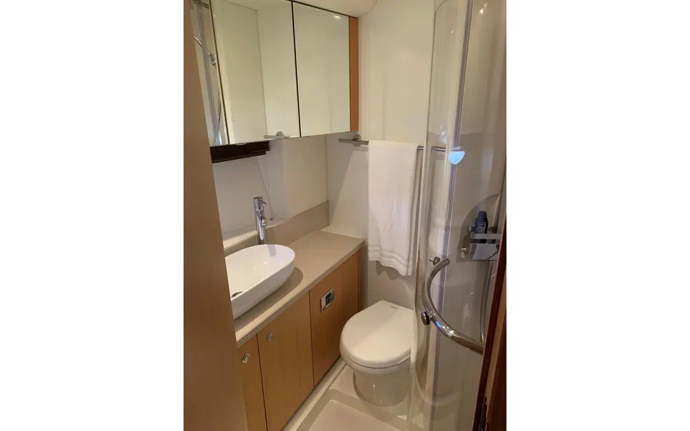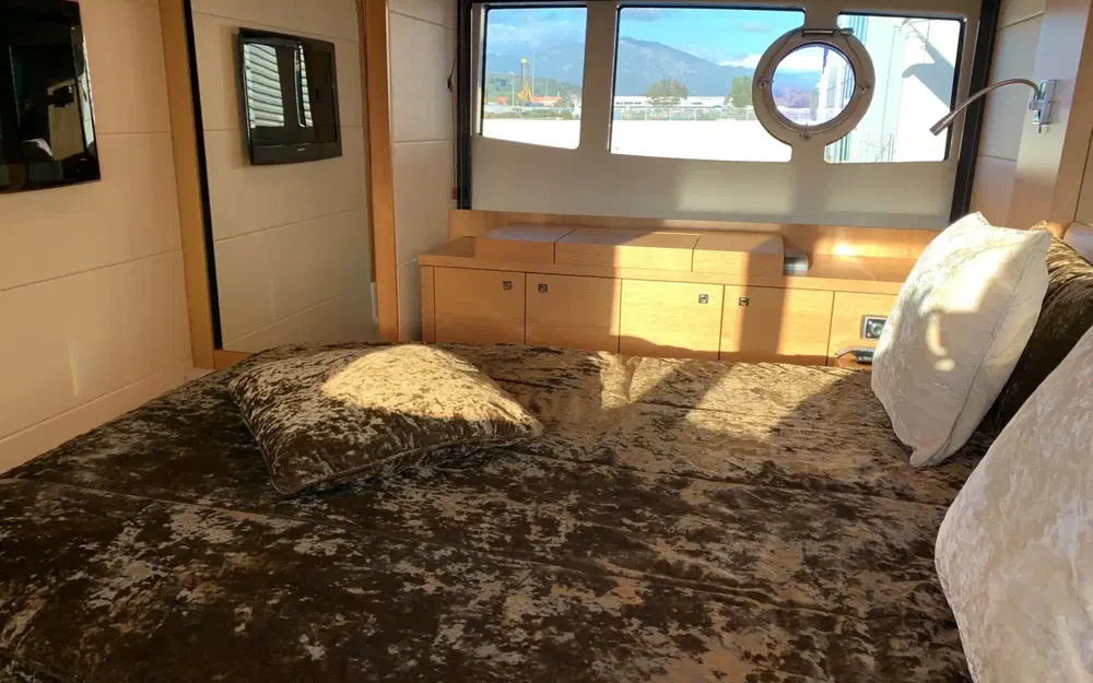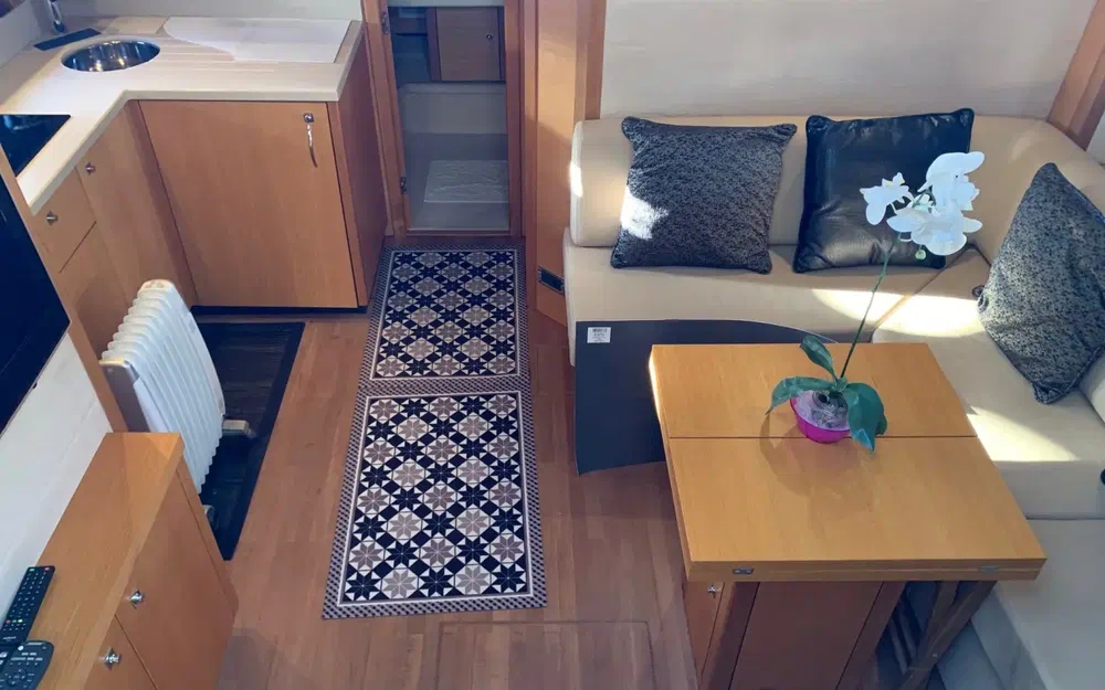 Ce bateau spacieux et bien équipé offre au propriétaire une cabine centrale pleine largeur avec salle de bain et une cabine d'invités polyvalente à l'avant.